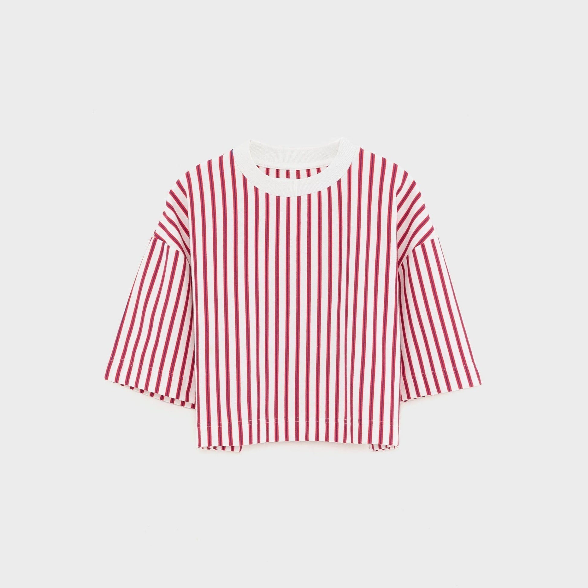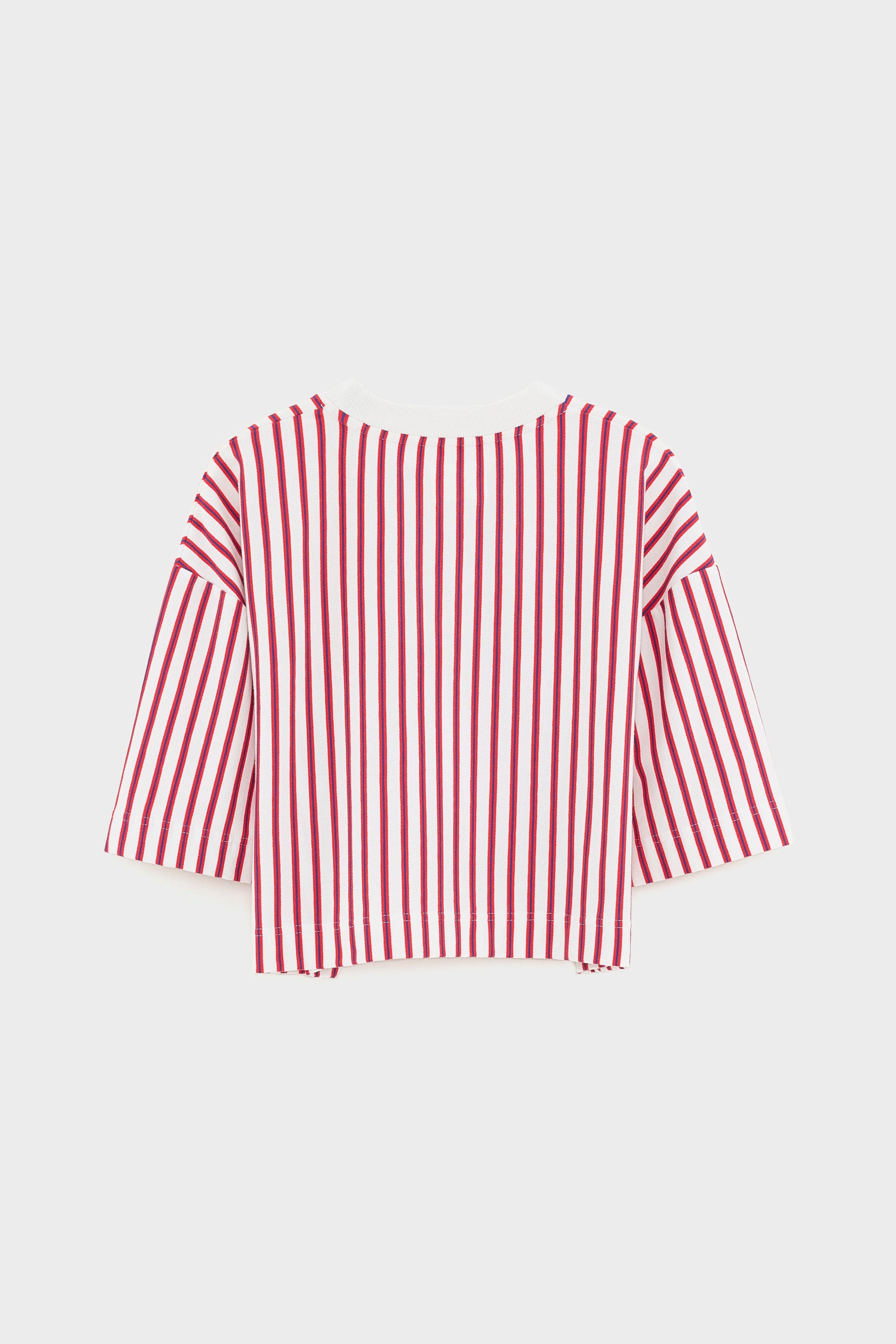 Cropped t-shirt in soft cotton featuring a white base with vertical red and blue stripes.