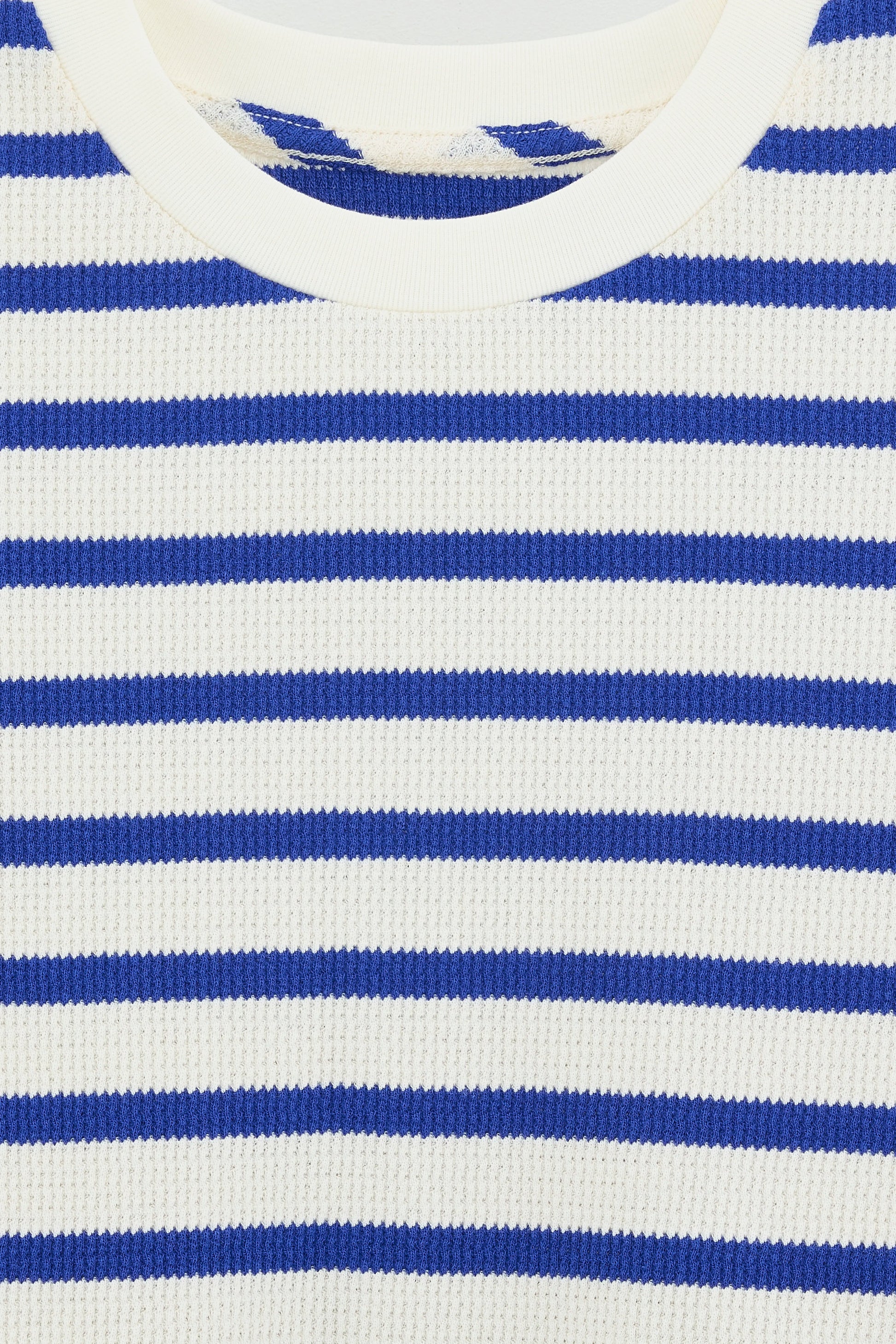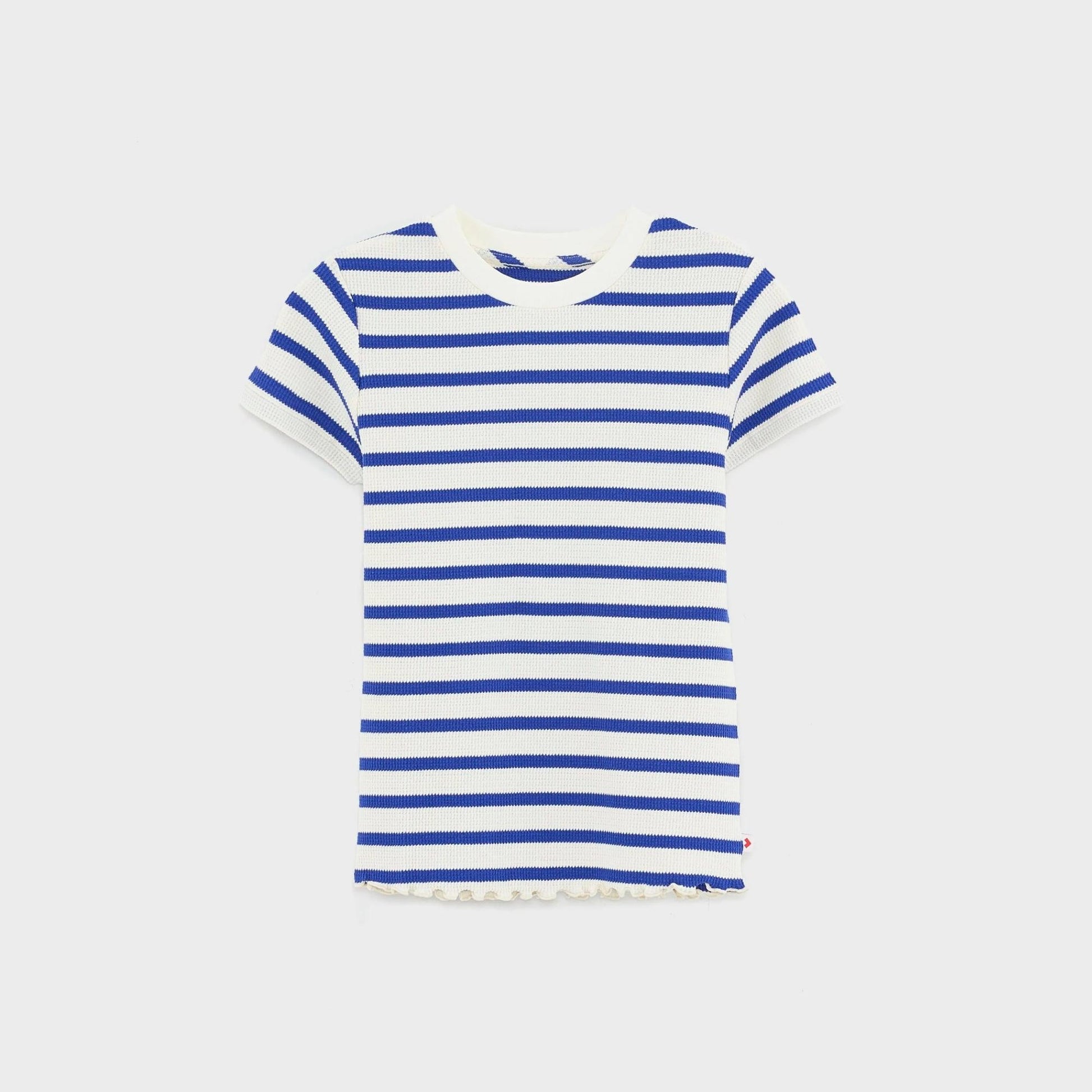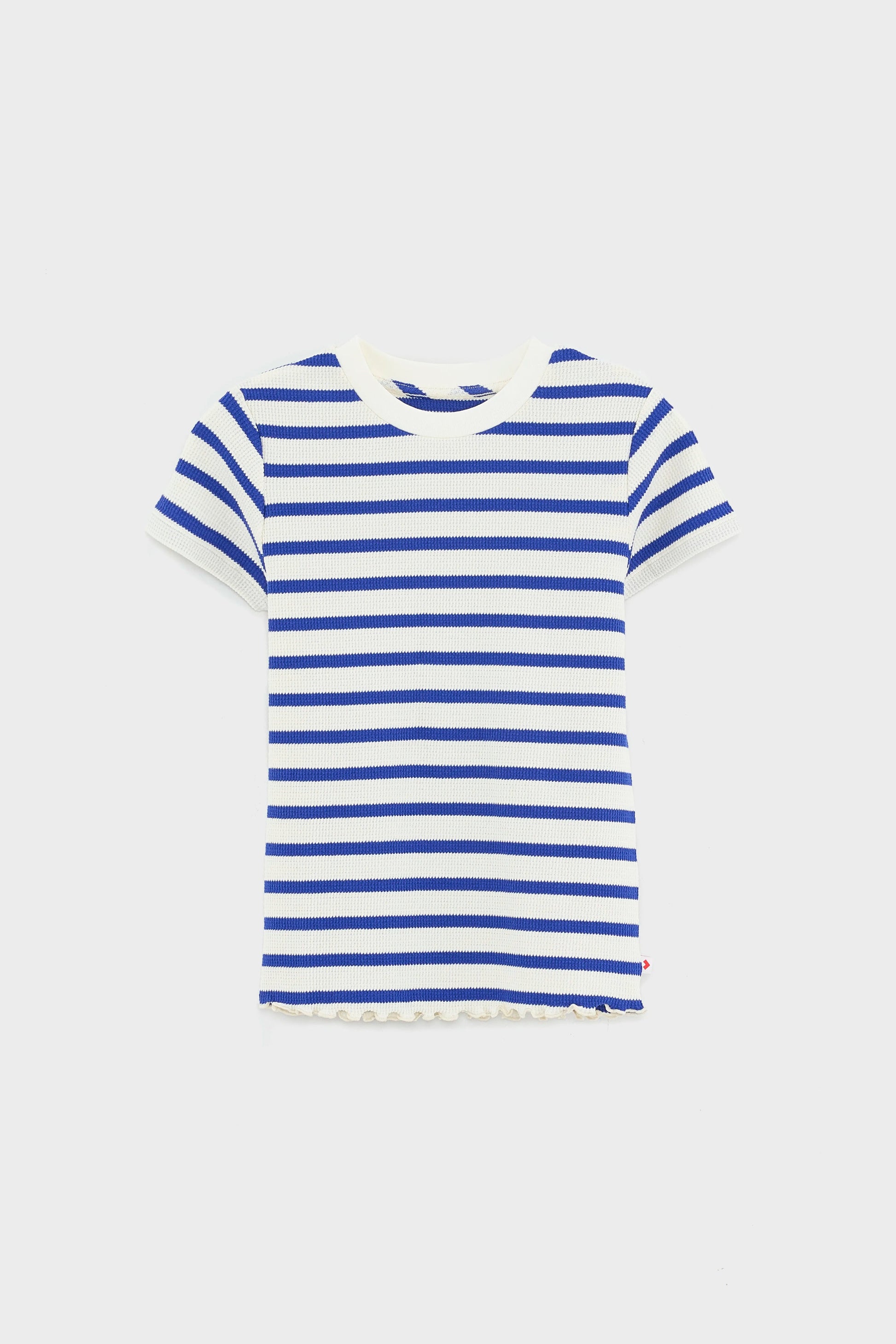 Fitted t-shirt in ivory ribbed cotton with a waffle texture and cobalt blue stripe pattern, featuring short sleeves and a classic crewneck.