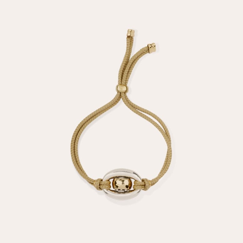 Cophea Link bicolor bracelet, inspired by marine knitwear, features a curved with a delicate link tied to the pendant. A couture piece that combines lightness and a sense of style. Adjustable size.
