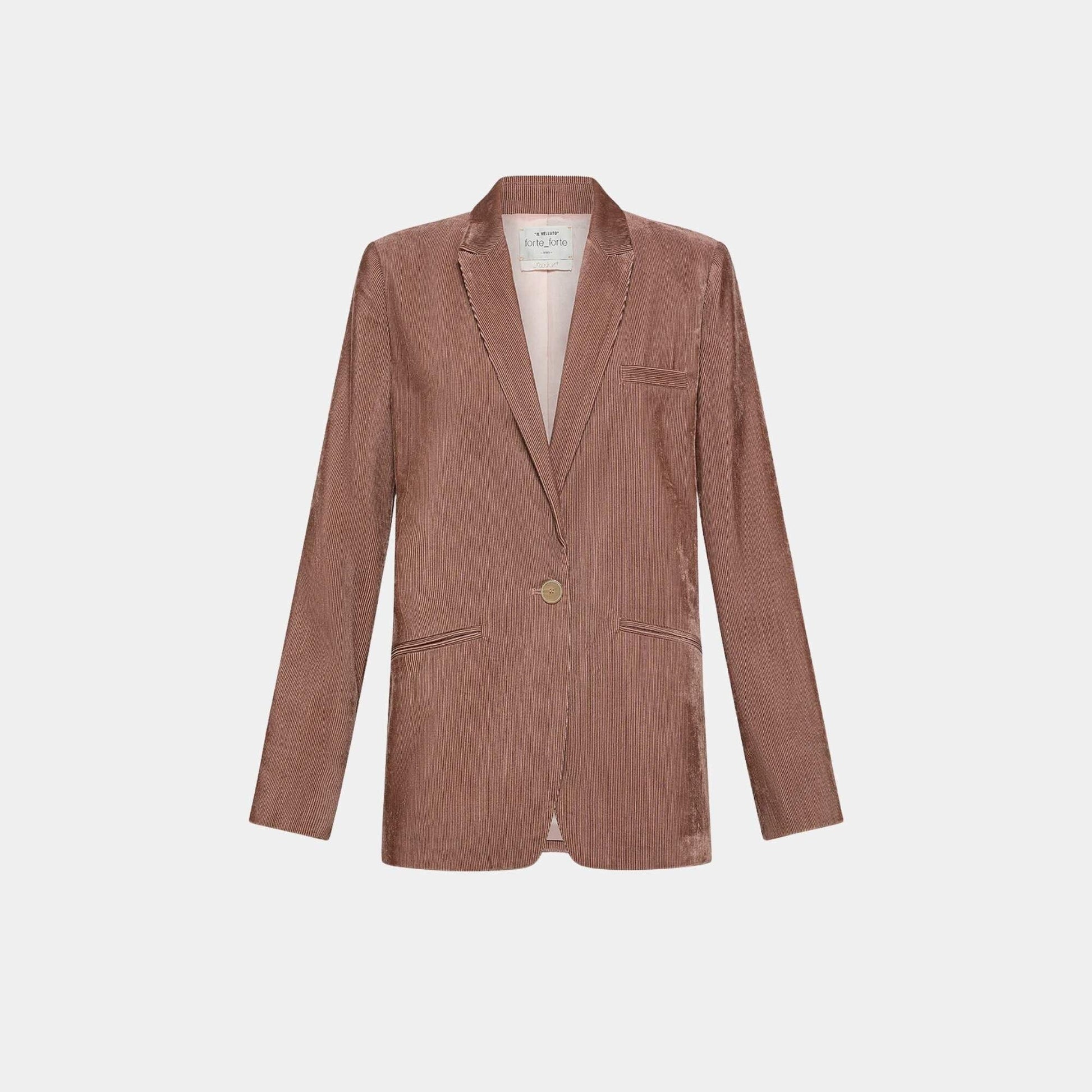 Nice and festive blazer in dusty pink corduroy. The blazer is fully lined and has discreet shoulder pads, which give a slightly waisted shape over the shoulders and an otherwise slightly loose, but feminine fit. It has classic lapels, three welt front pockets and is rounded off with a slit at the back and a single button closure.