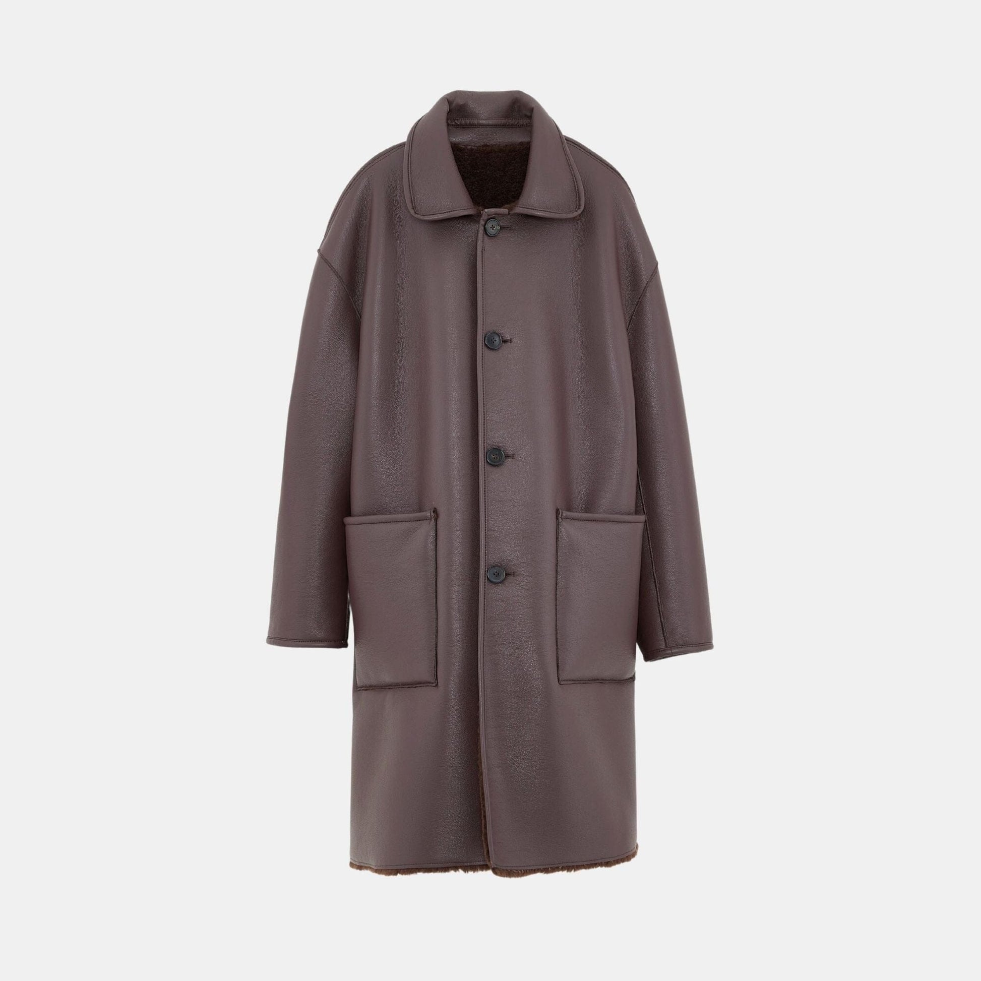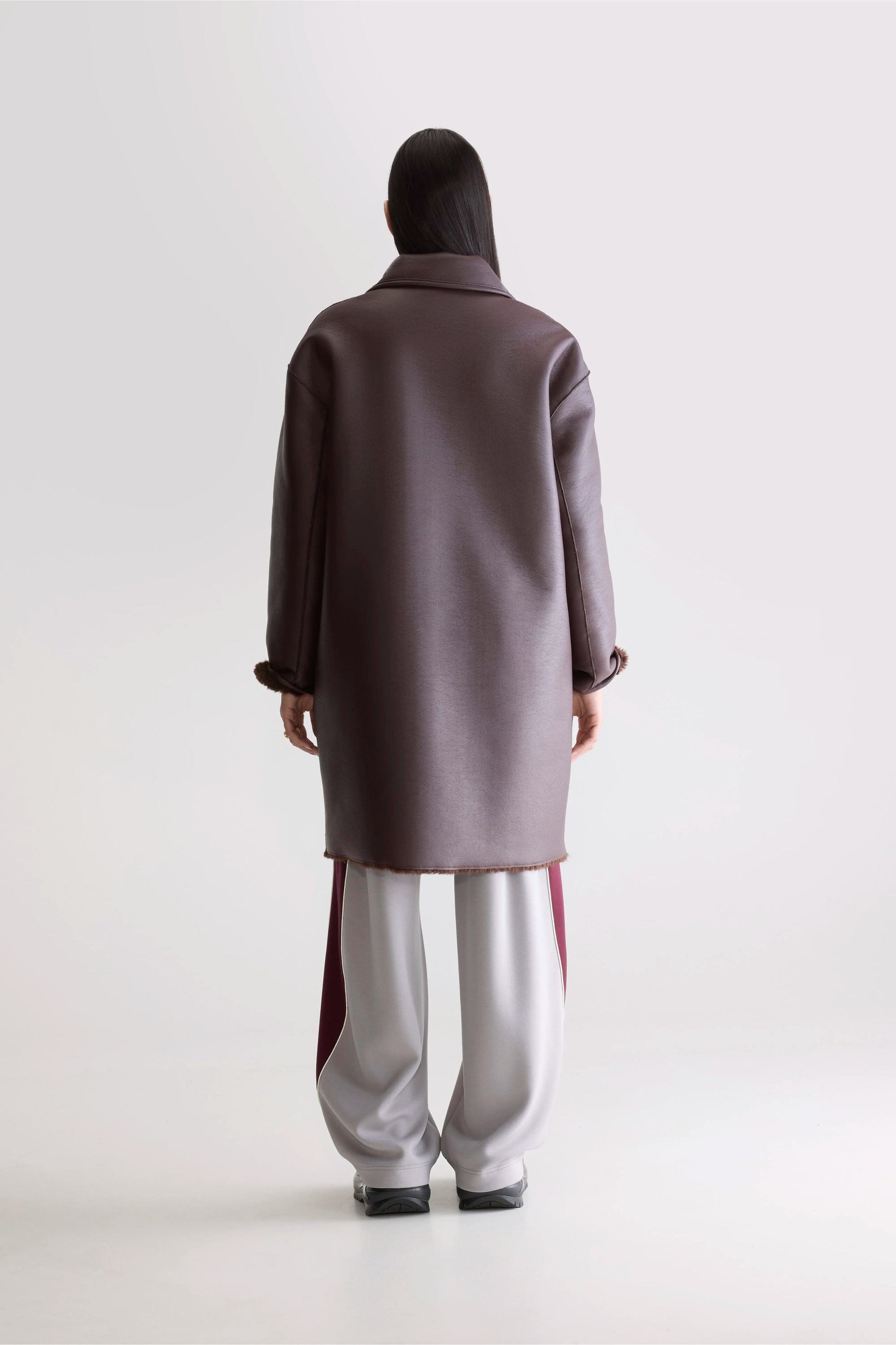 Reversible long faux fur coat in dark chocolate, with one side in teddy and the other in faux leather.