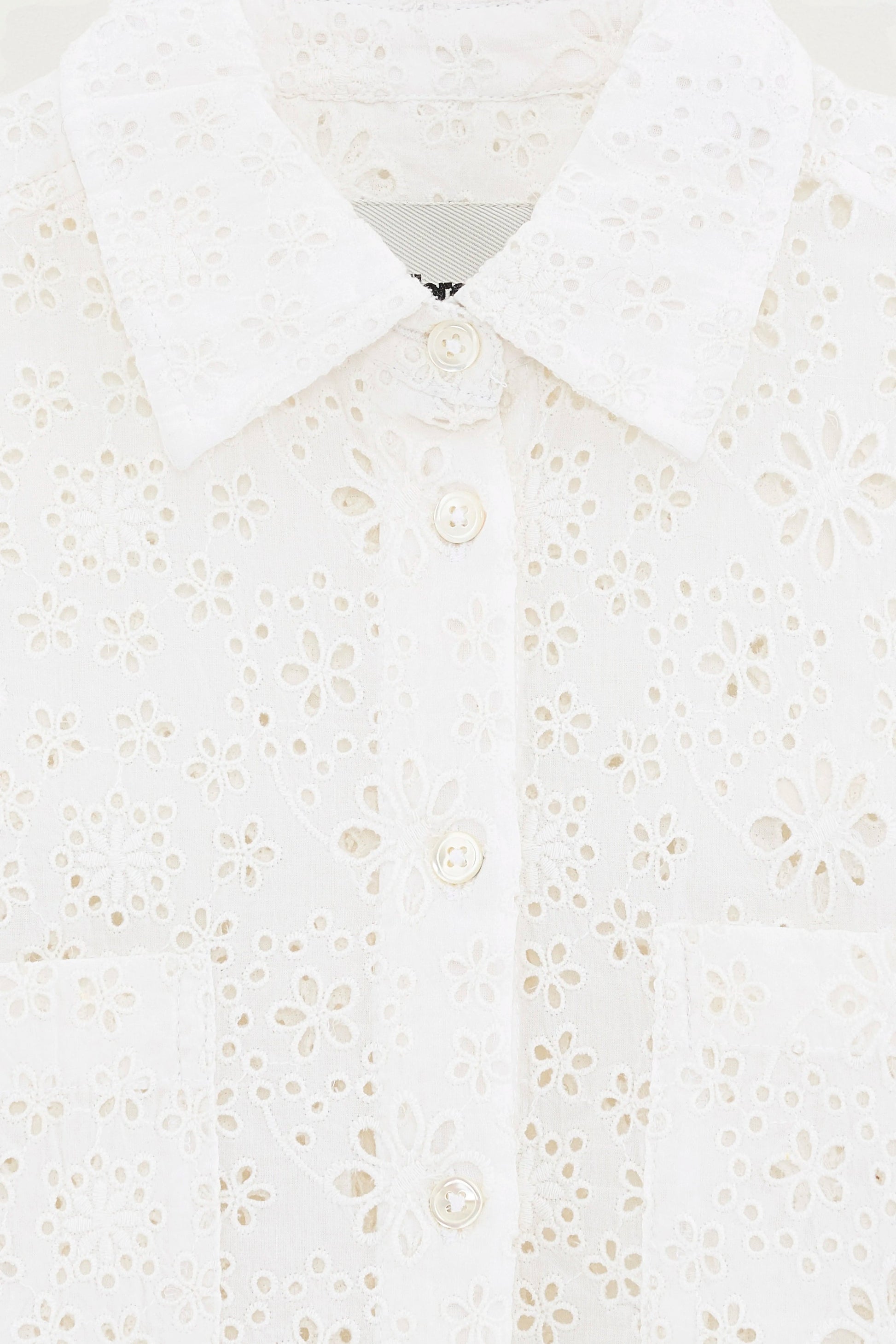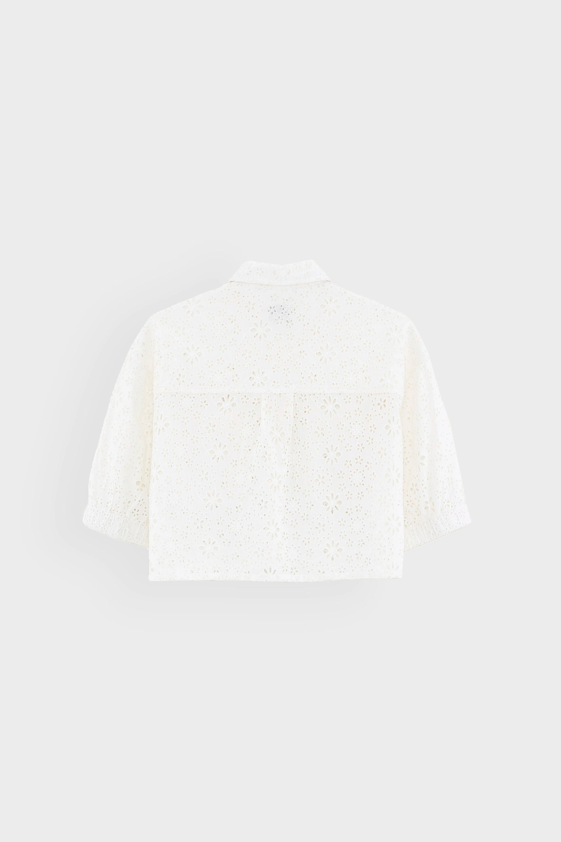 Relaxed cropped white shirt with short puff sleeves, low patch pockets, a classic collar, and delicate floral broderie anglaise embroidery.