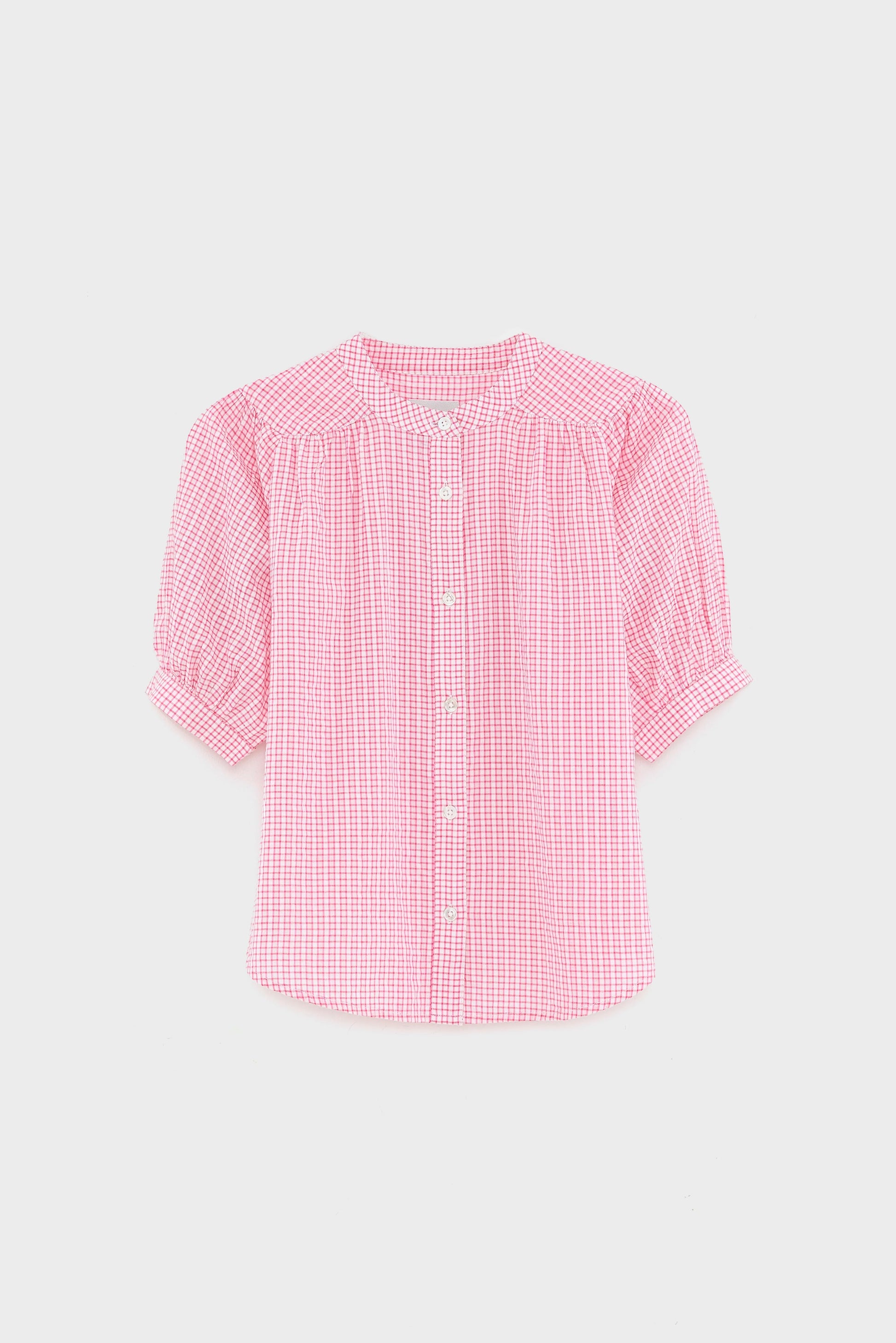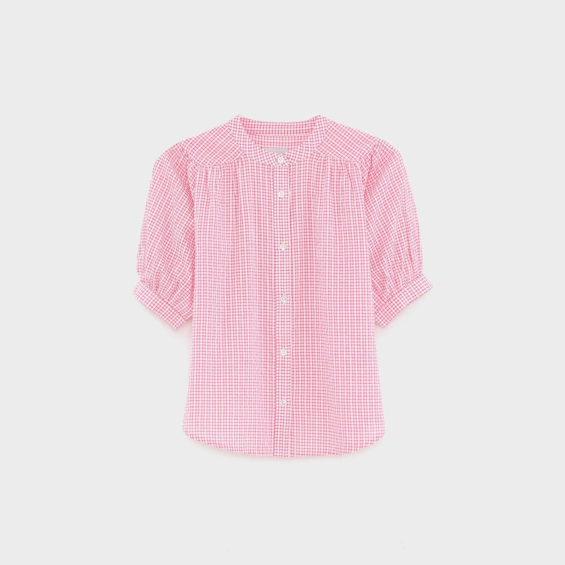 Oversized pink blouse in checked cotton, featuring subtle gathers at the chest and back and short puff sleeves.