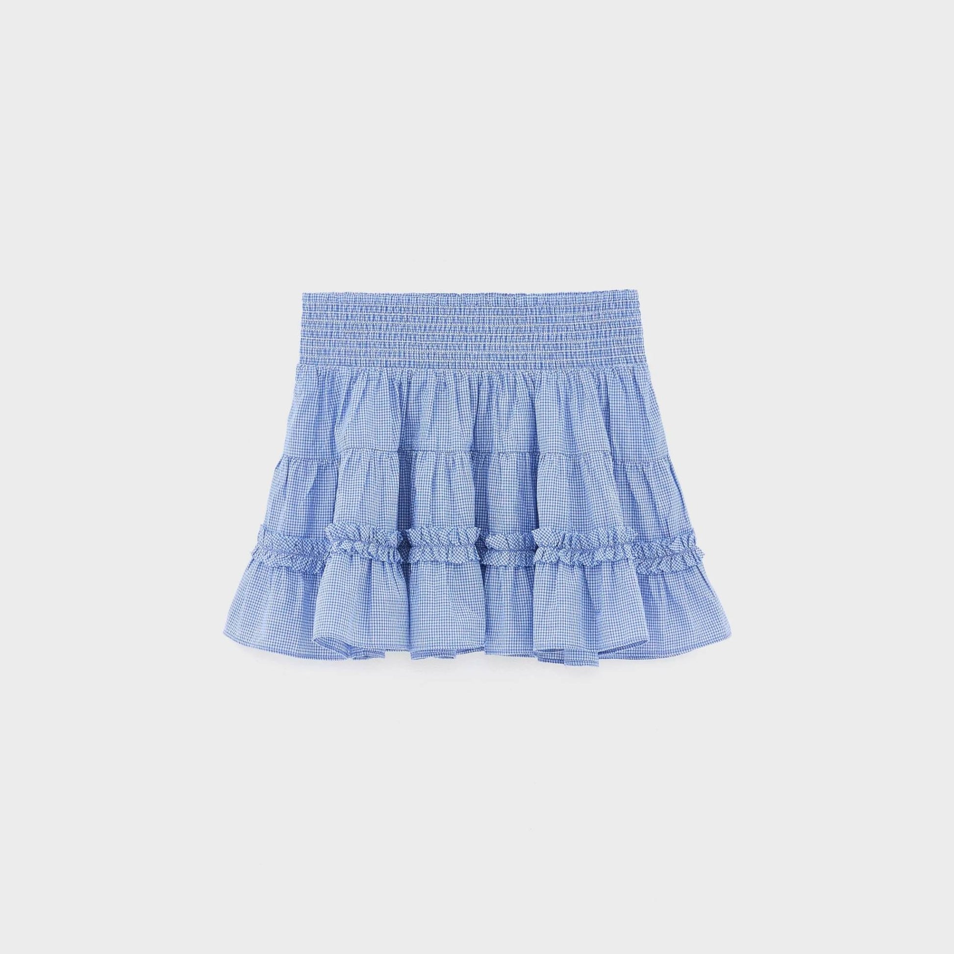 Mini tiered skirt with an elastic smocked waist, made from blue gingham cotton.