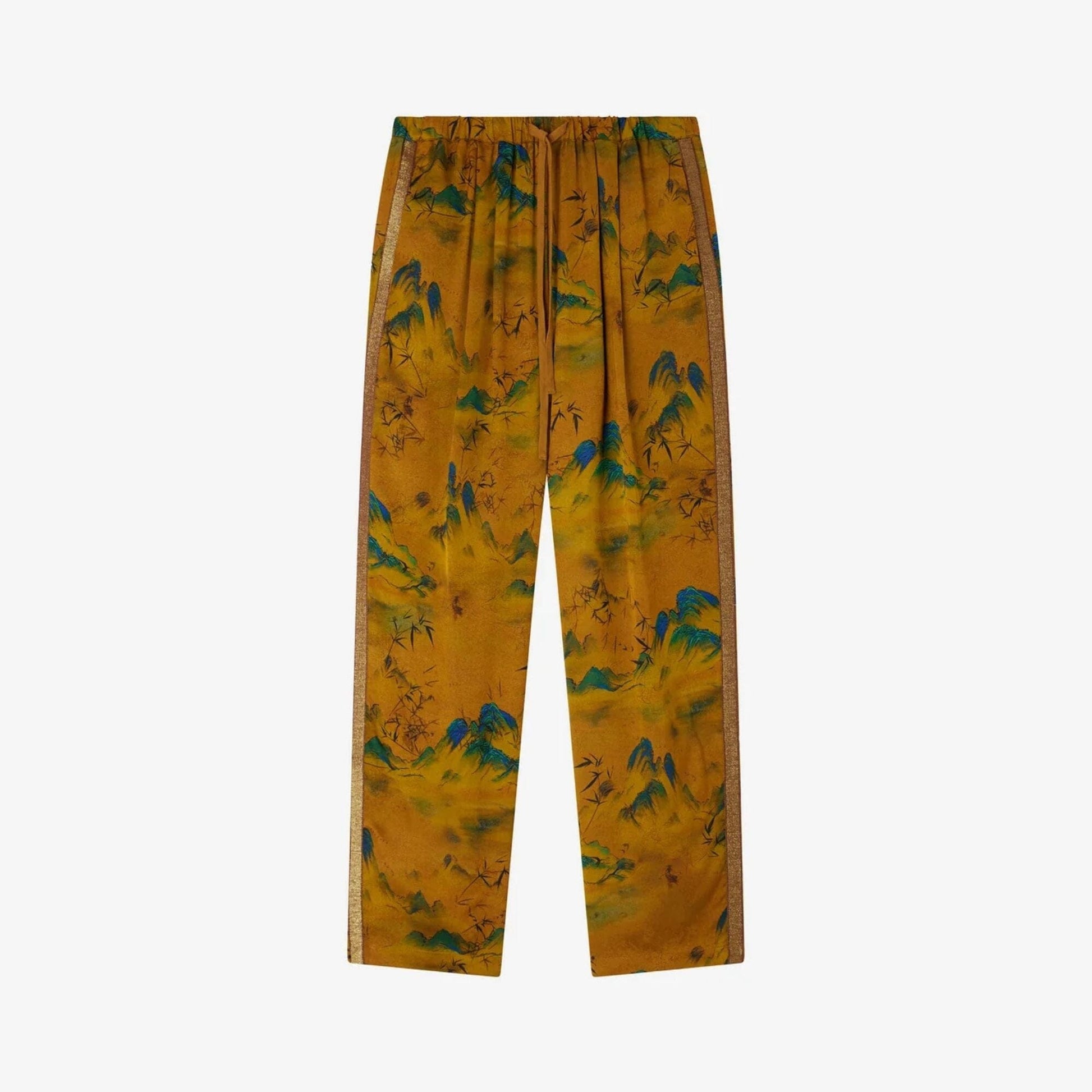 These jogging-style pants combine comfort and sophistication. Made from viscose jacquard printed on an ochre background, they feature an elasticated waistband and side pockets for a relaxed look. A solid ochre lurex braid runs along the legs, adding a bright, contrasting touch. Their fluid, contemporary cut makes this style a statement piece, perfect for pairing with the "Mesha" kimono.