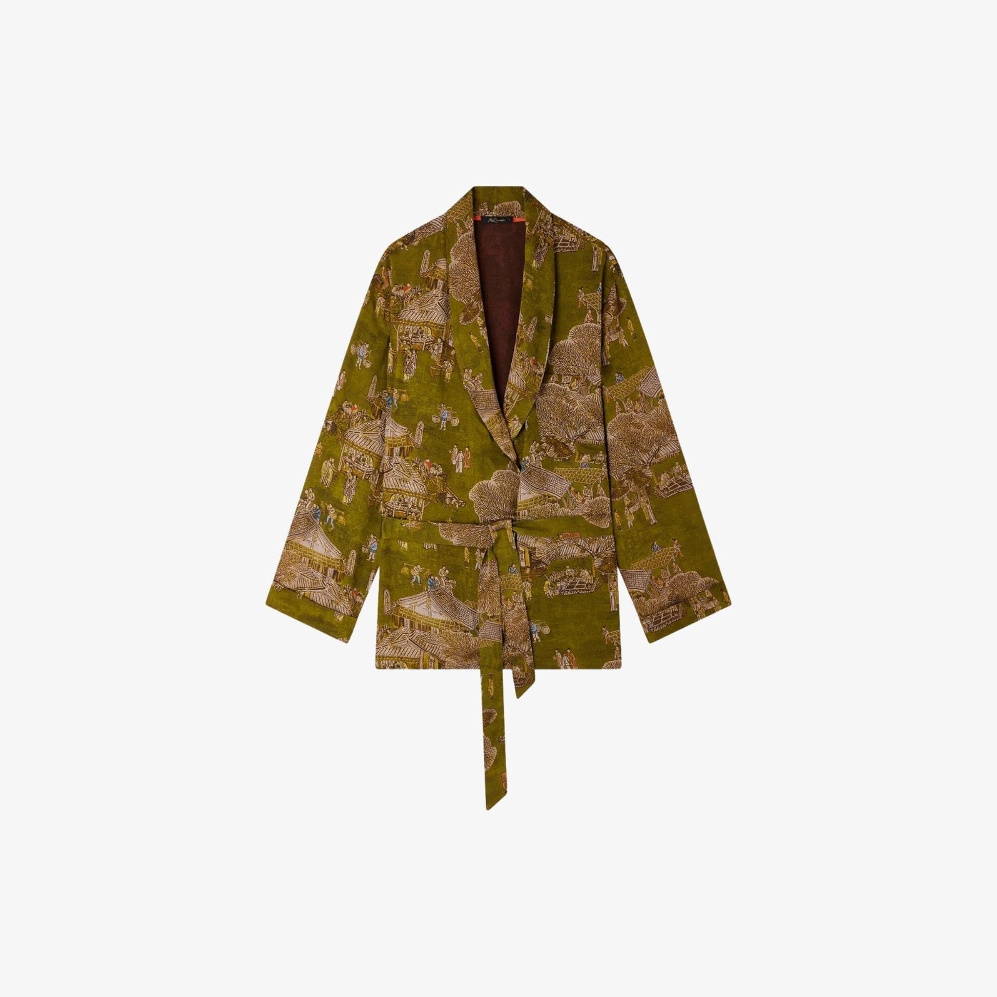 This viscose jacquard kimono is presented on a deep green background, elevated by a refined print playing with contrasts.