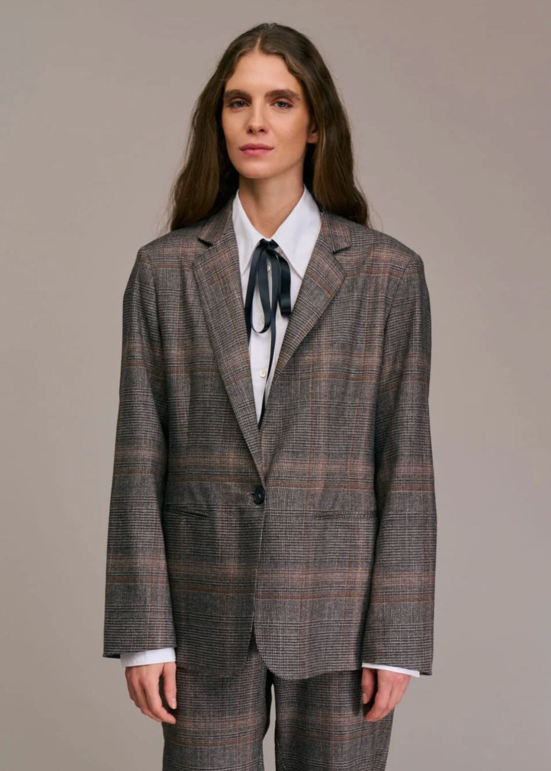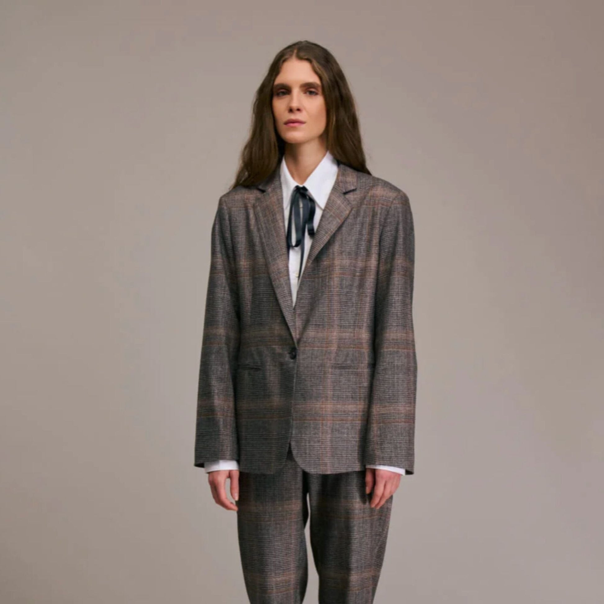 A tailored jacket cut in a classic checked wool with shades of brown and grey. Designed with a single-breasted front, notched lapels, and a single button closure, it offers a slightly oversized silhouette. Finished with flap pockets and structured shoulders, this jacket has a timeless menswear-inspired look that pairs easily with matching trousers or jeans.