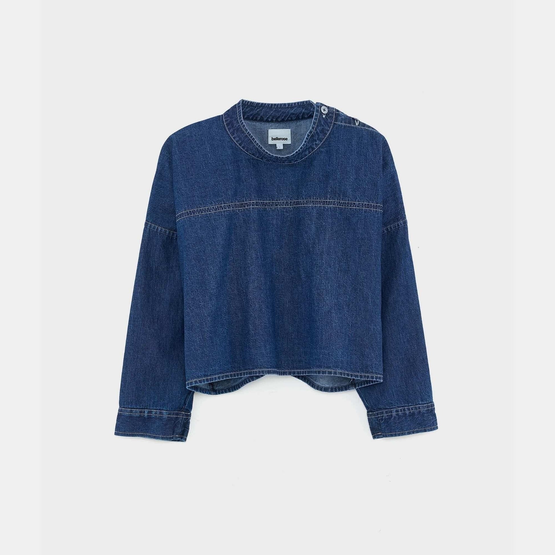 Relaxed denim blouse in medium blue cotton with utilitarian details on the shoulder.