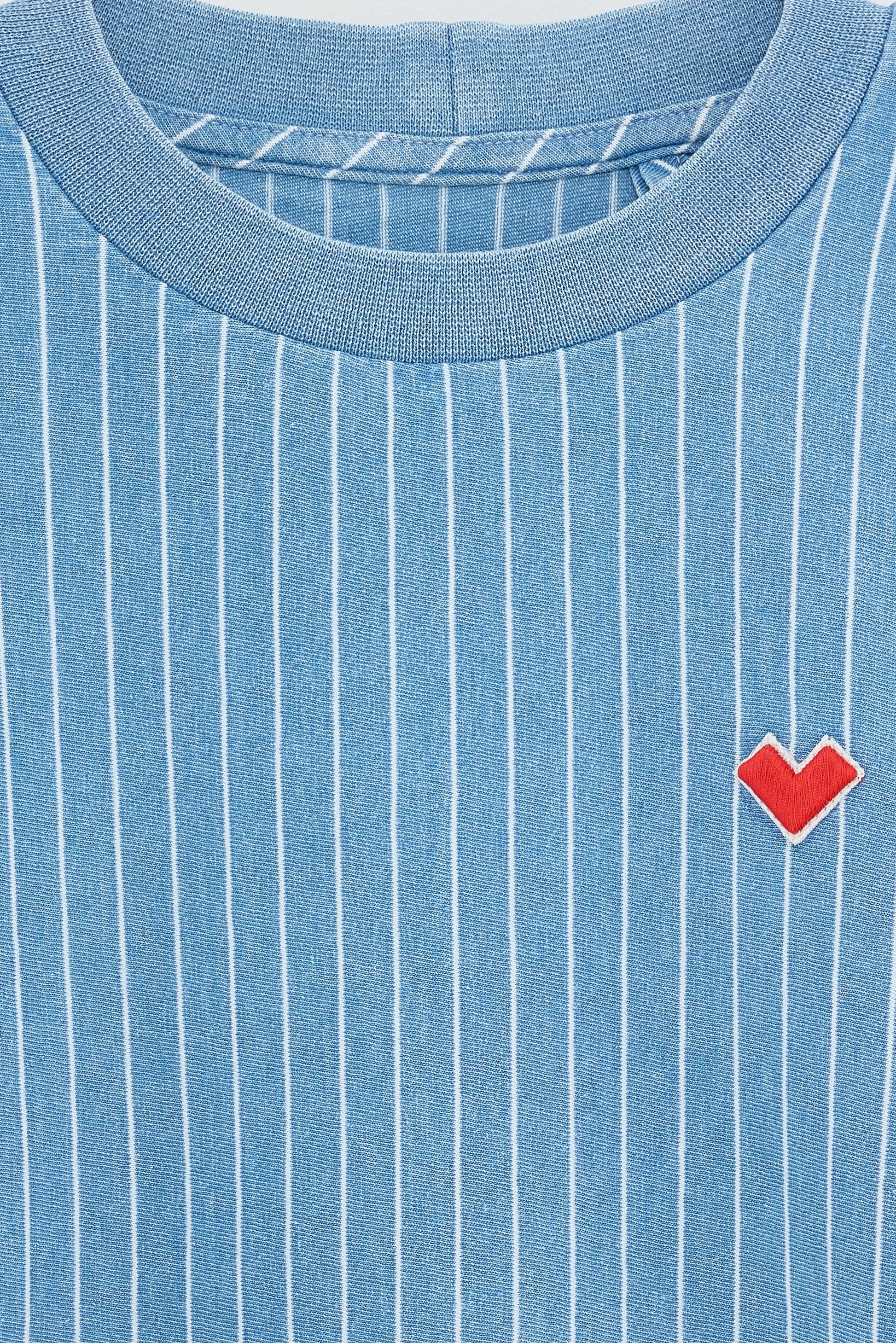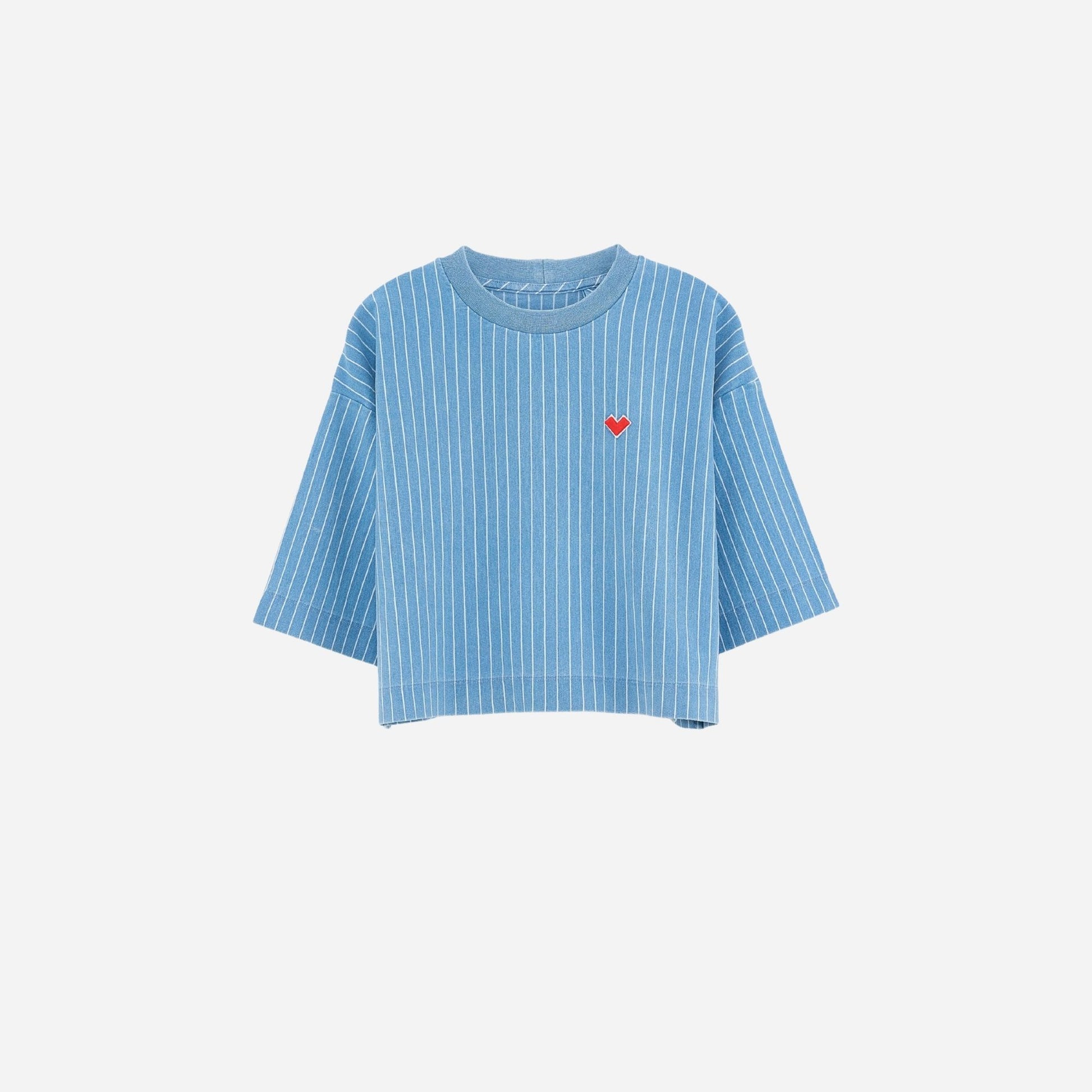 Cropped t-shirt in soft cotton featuring a sky-blue base with fine white pinstripes and a small embroidered red heart detail on the chest.