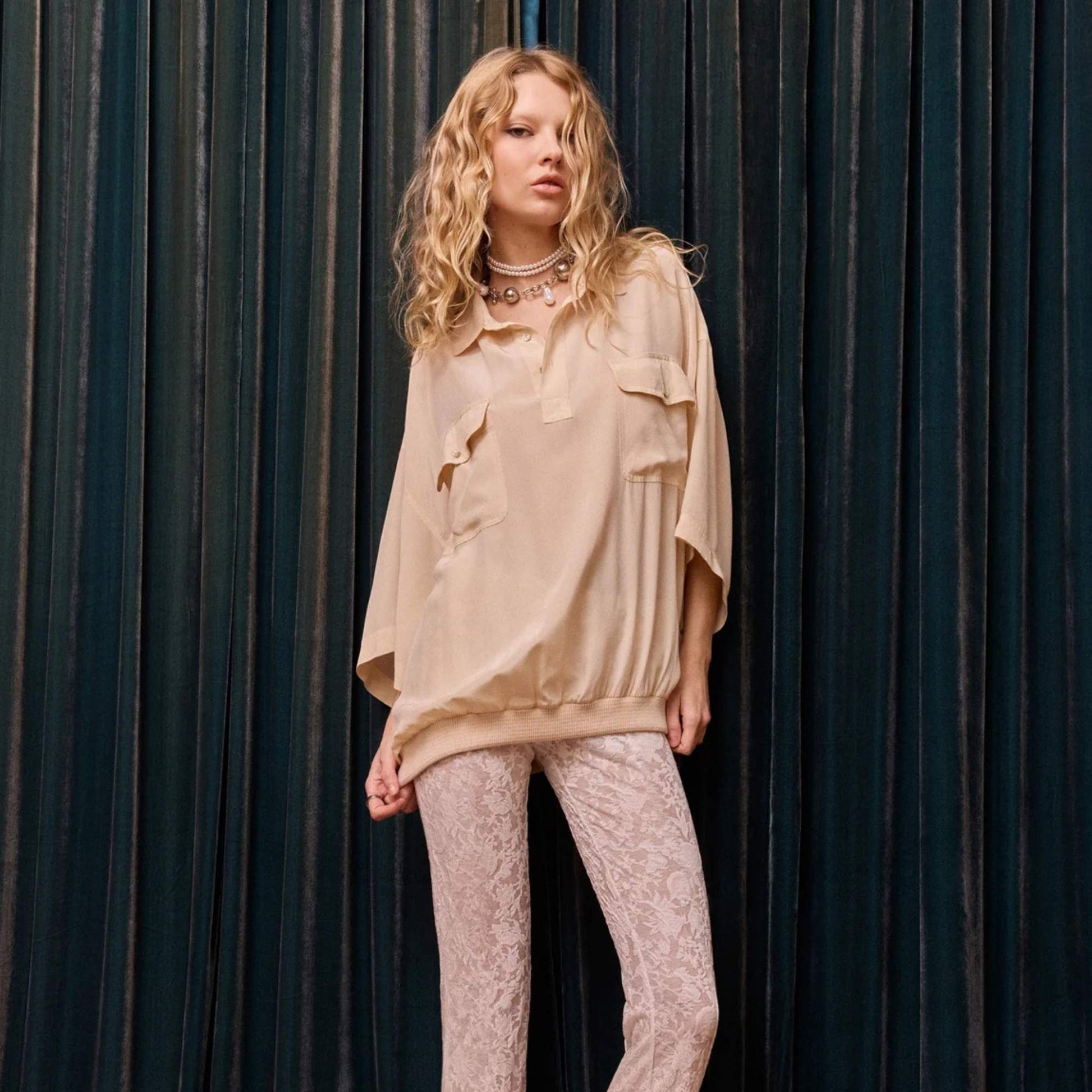 Oversized polo shirt in nude crepe de chine silk, fluid and slightly satiny, with a soft and elegant drape. The tone-on-tone knitted ribbed collar and hem add a sporty and modern touch to this refined piece. The patch pockets with flaps on the chest structure the silhouette while maintaining the relaxed feel of the design. A chic and contemporary top, to be worn alone for a minimalist look or paired with the "Berla" trousers for a soft and natural nude ensemble.