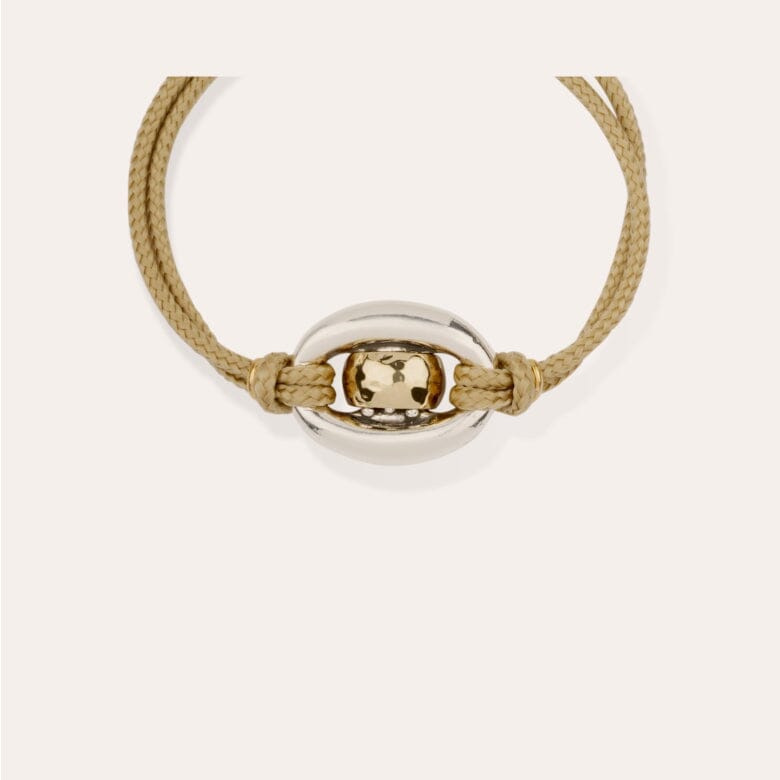 Cophea Link bicolor bracelet, inspired by marine knitwear, features a curved with a delicate link tied to the pendant. A couture piece that combines lightness and a sense of style. Adjustable size.