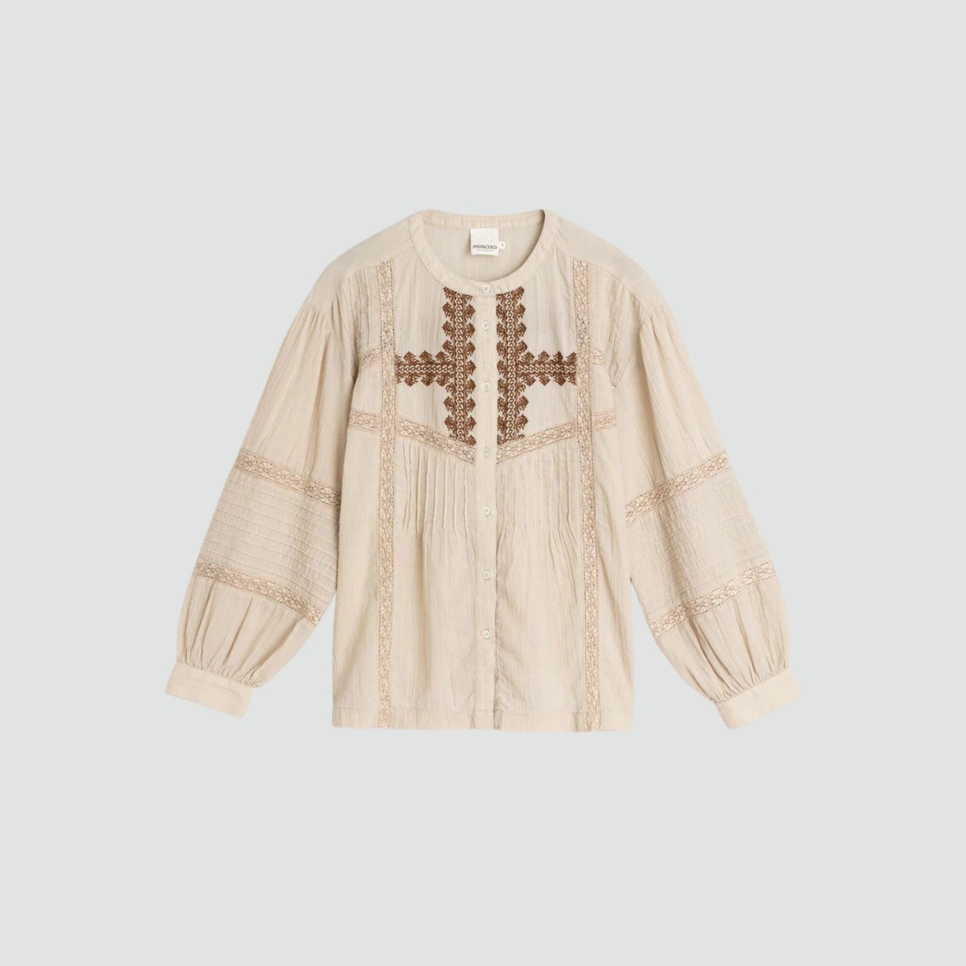 If you're looking for a romantic shirt, this is your ally for the season. Slightly dropped shoulders and balloon sleeves, plus a regular fit. Full of details like ethnic embroidery, lace inserts and pleats.