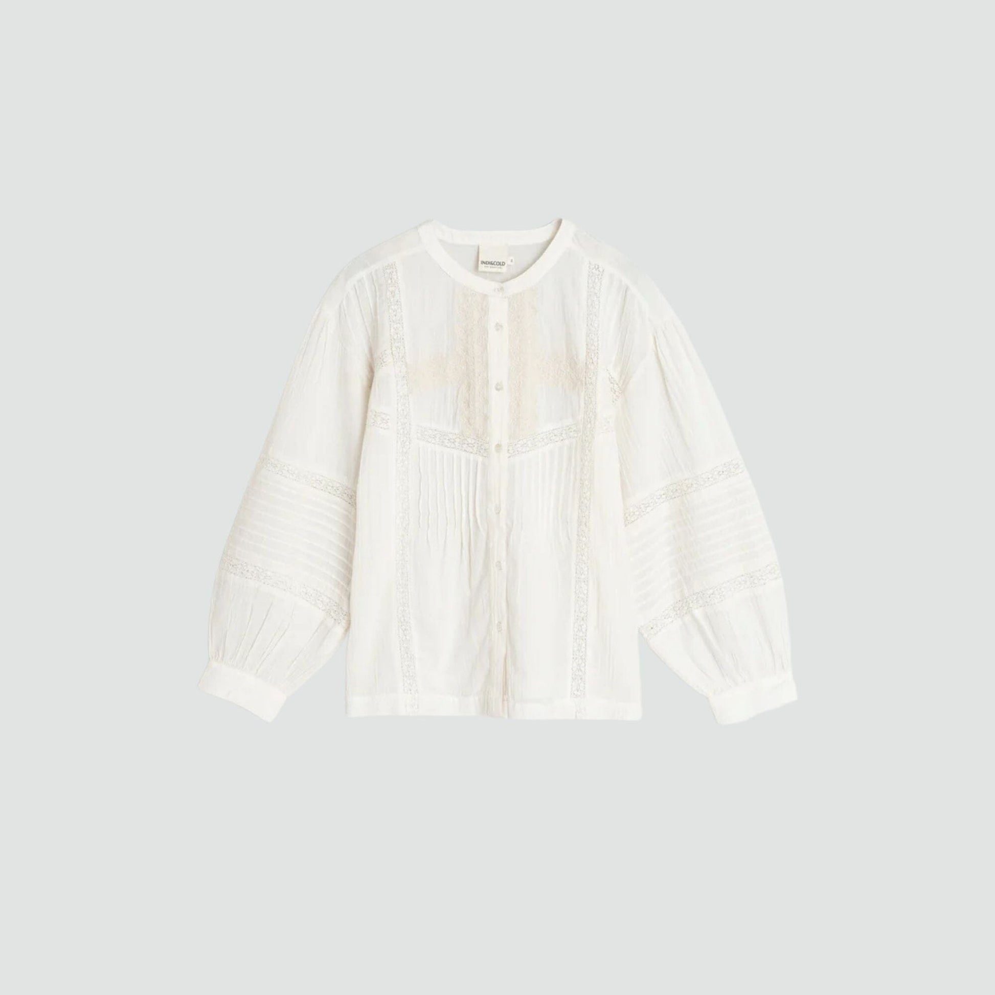 If you're looking for a romantic shirt, this is your ally for the season. Slightly dropped shoulders and balloon sleeves, plus a regular fit. Full of details like ethnic embroidery, lace inserts and pleats.