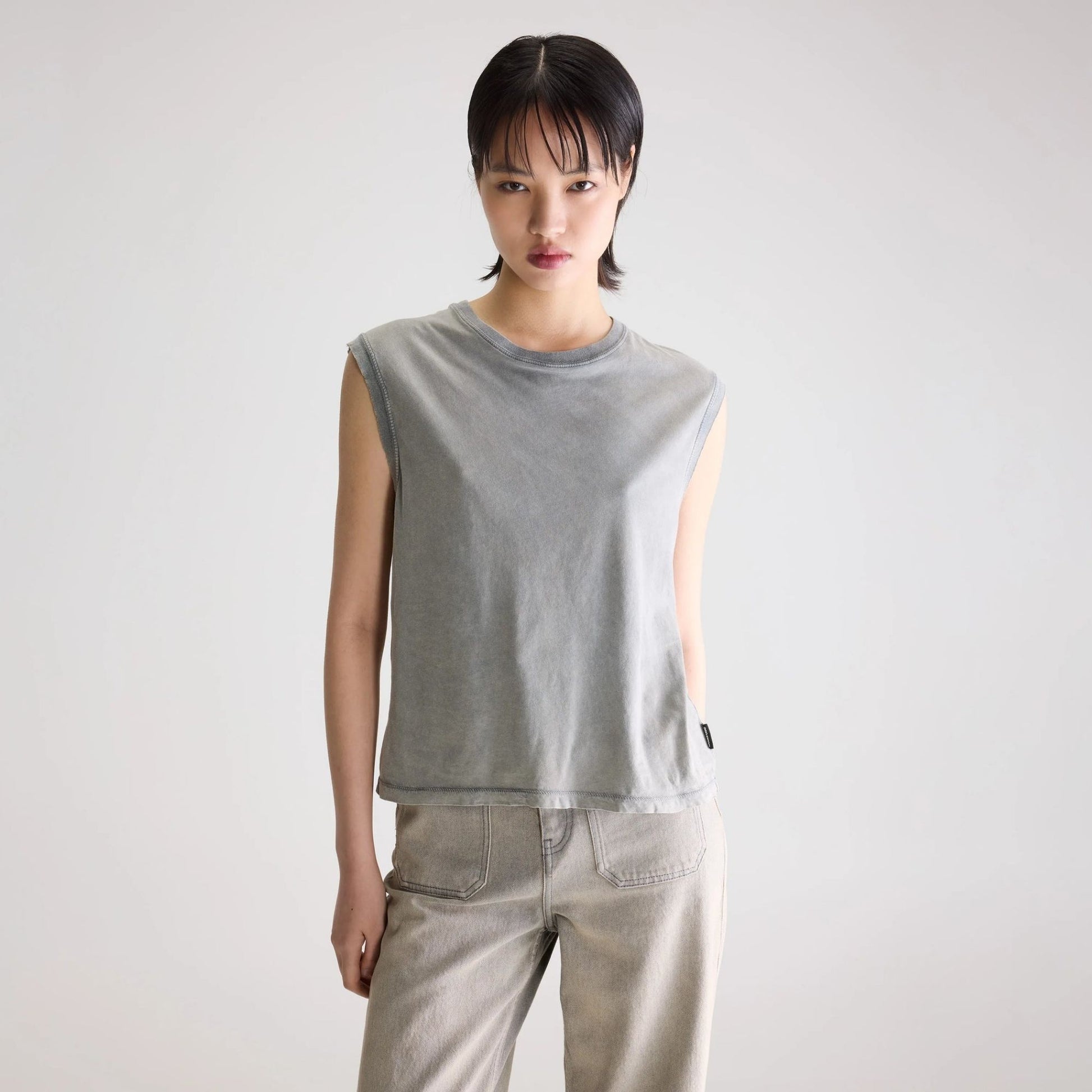 Sleeveless t-shirt crafted from a lightweight washed cotton jersey with a sun-faded grey tone and featuring relaxed dropped armholes.