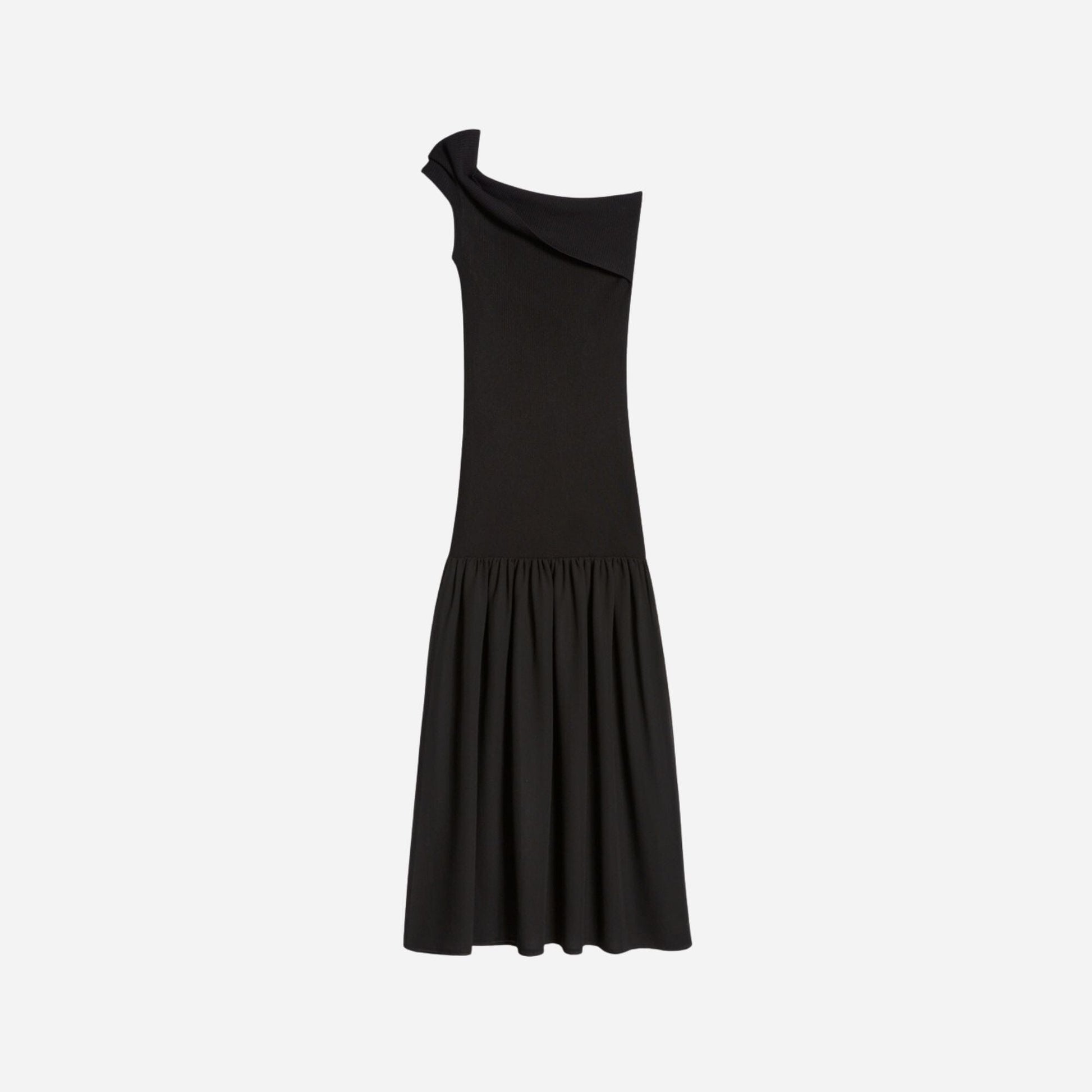 A dress with sculptural femininity, combining ribbed knit and sheer fabric in a bold and sensual silhouette.