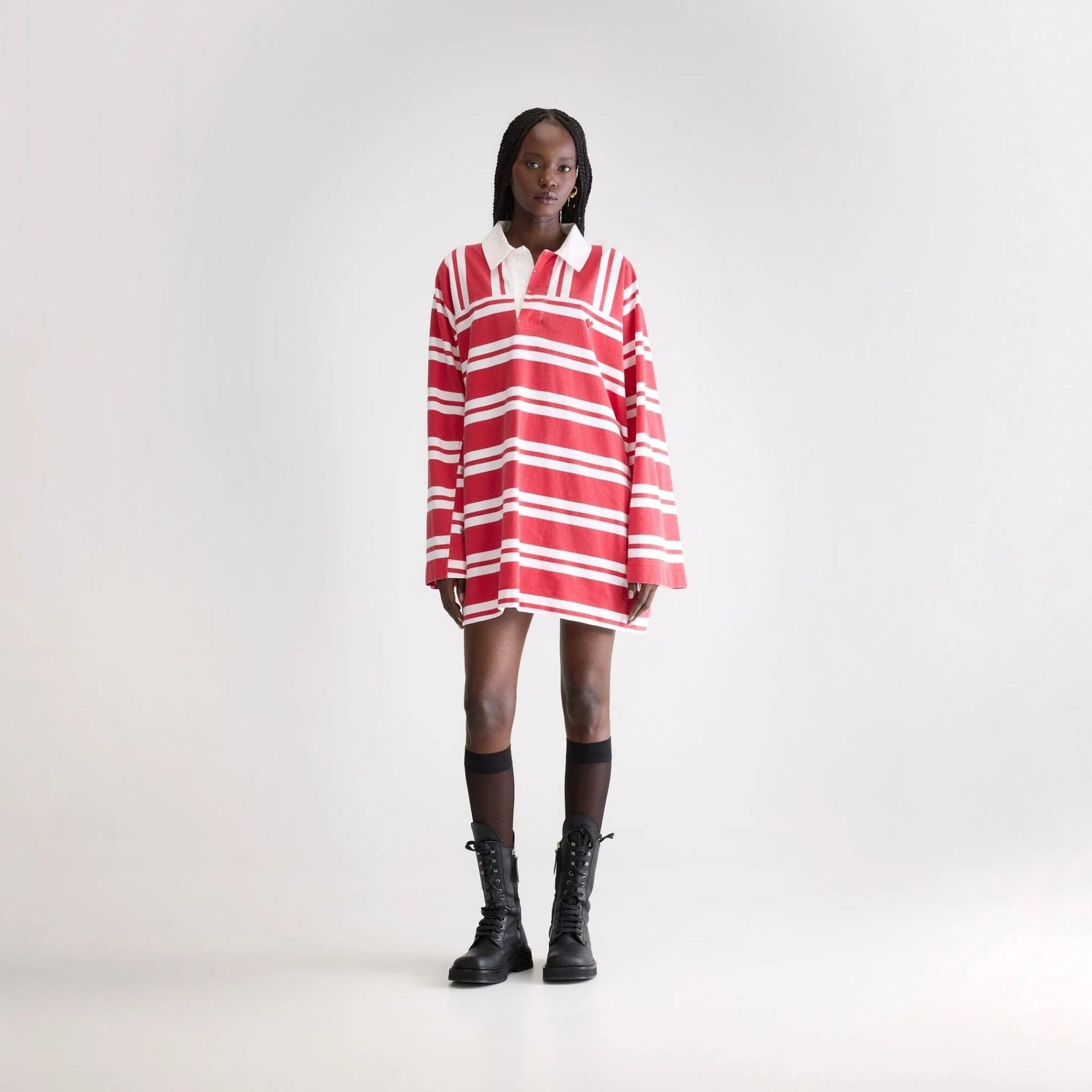 Oversized rugby-style dress in red and white stripes with a classic white collar.