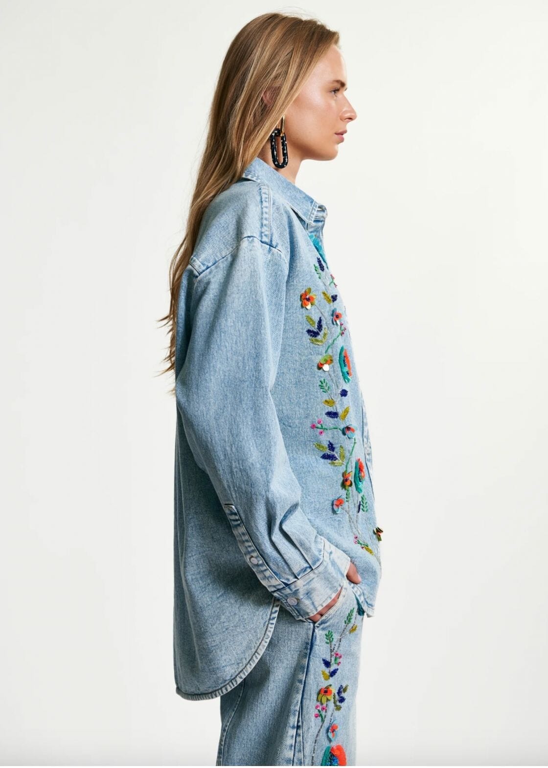 Crafted from 100% cotton denim, this shirt is tailored for an oversized fit. Dropped shoulders and a rounded hemline emphasize its casual silhouette, while the longer back hem offers added coverage. The front is detailed with delicate sequin-embellished flowers, introducing a subtle contrast of texture and shine. Finished with a full button fastening.