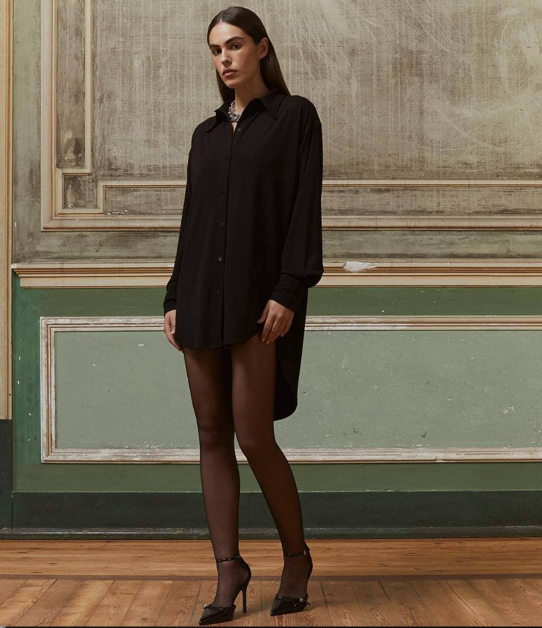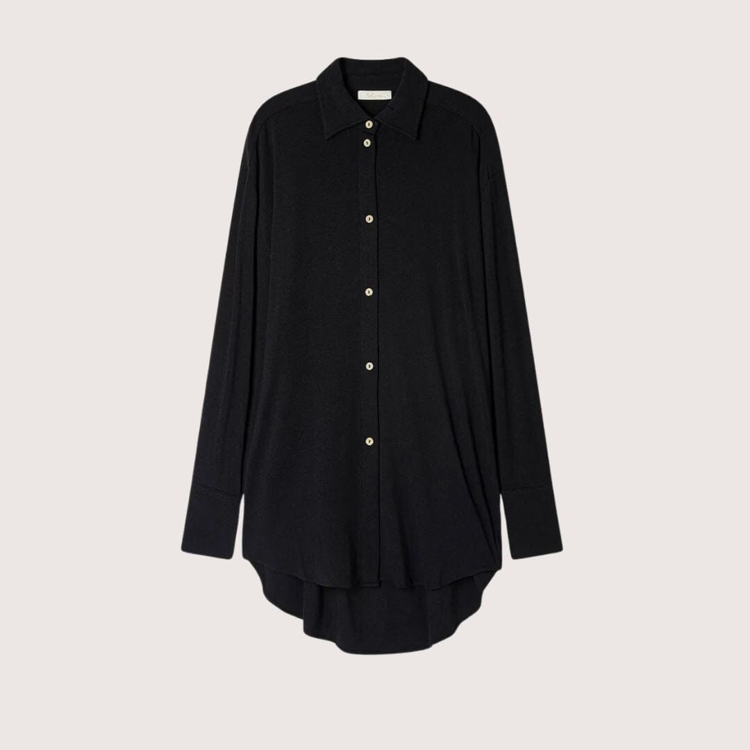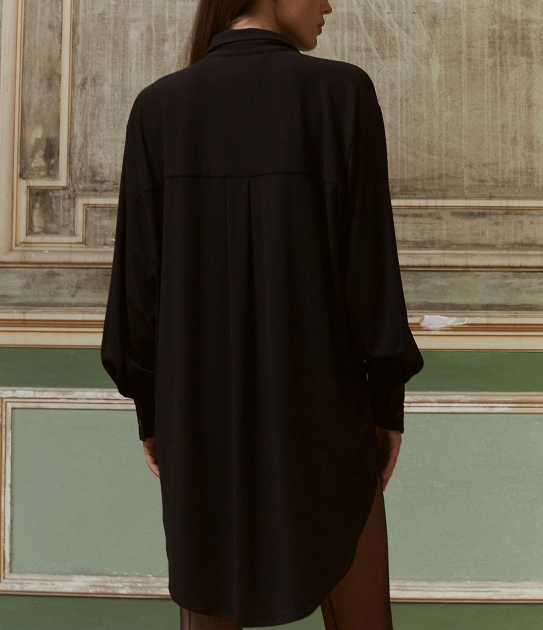 Designed in fluid black fabric, this elongated button-up shirt offers a relaxed fit with a high-low hemline, creating a bold yet understated look.