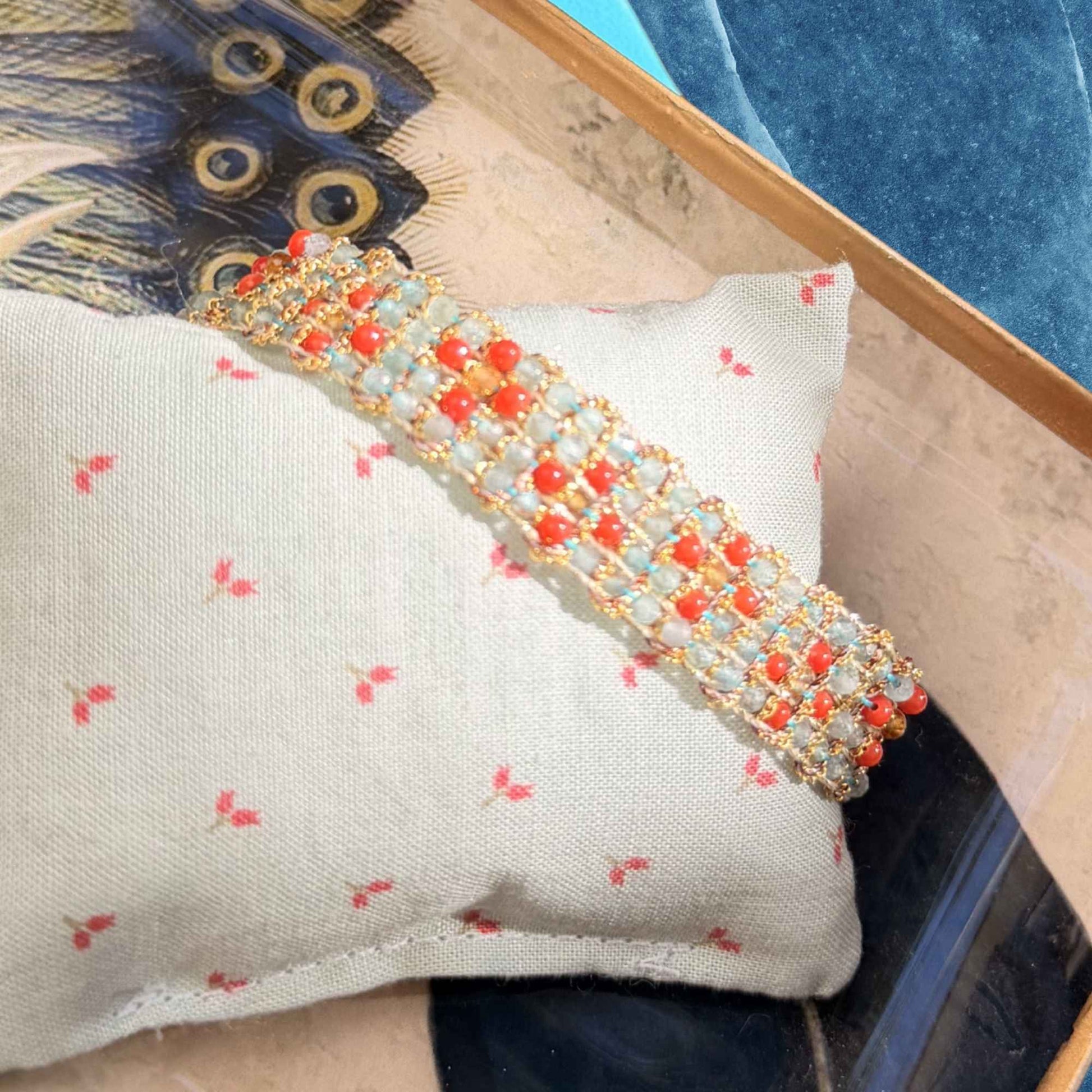 Handcrafted in Italy, this boho chic bracelet is made of gold plated 925 sterling silver and natural yellow tourmalines, corals and apatites. It is hand woven, including 4 rows of stones.Ā