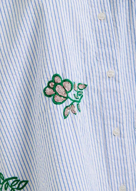 Cut from crisp 100% cotton, this pinstripe shirt is designed for an oversized fit with a boxy silhouette and dropped shoulders. The rounded hemline—slightly longer at the back—adds fluidity, while delicate floral embroidery with sequin and bead embellishments lend a touch of unexpected glamour. Button it up for sharp tailoring or leave it undone for an easy, undone elegance.