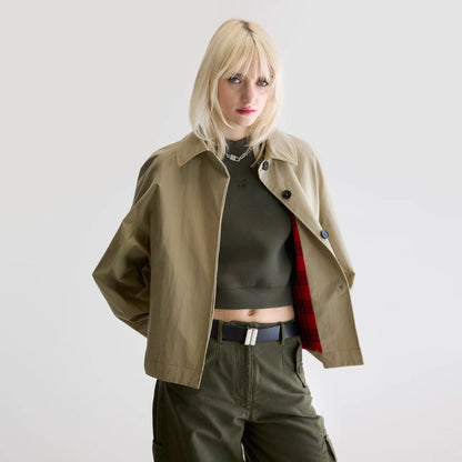 Relaxed trench jacket with a concealed button placket and raglan sleeves made from water-repellent beige cotton blend canvas.