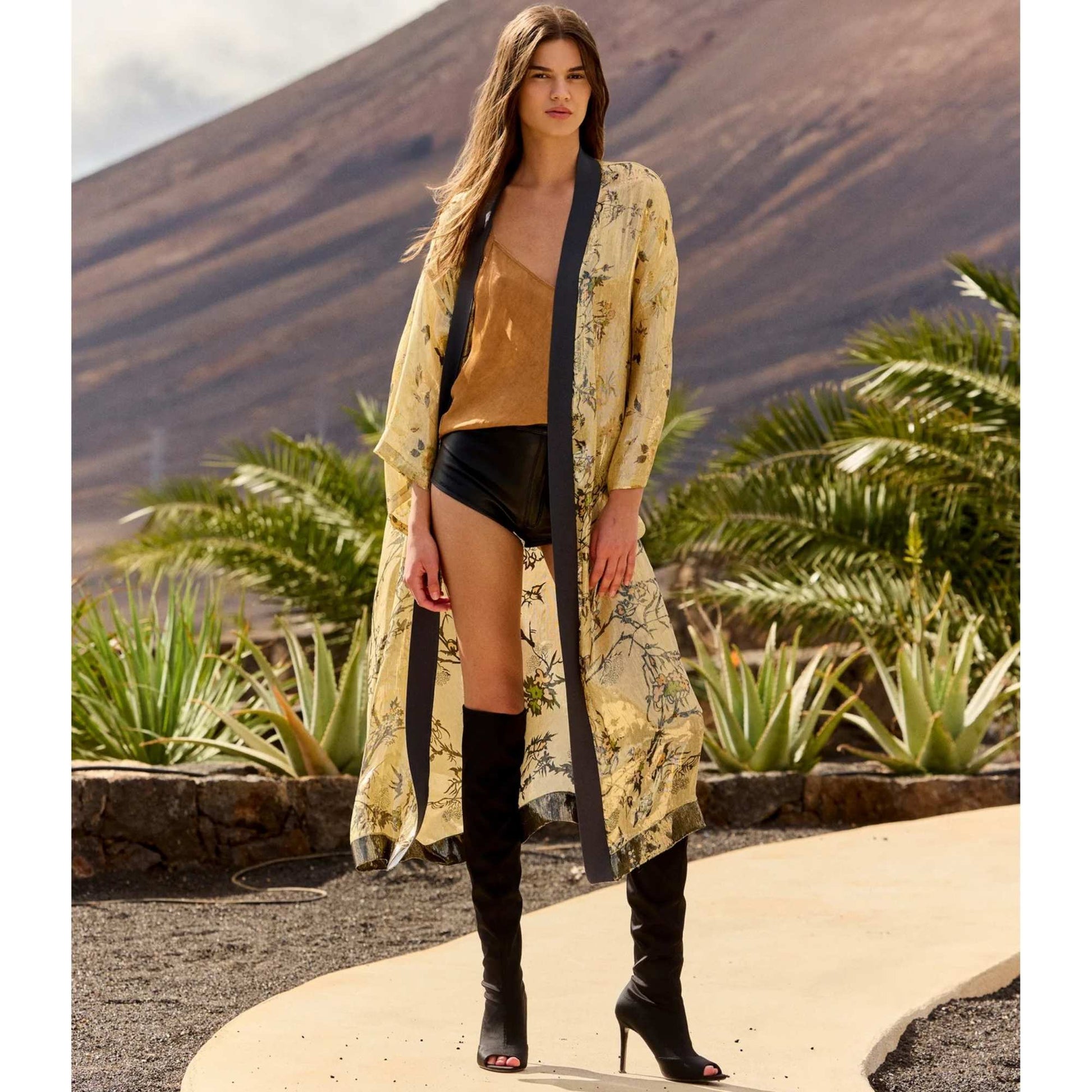 A flowing, lurex silk kimono with a shimmering, wet-look sheen, enhanced by a large floral print in gold and khaki tones. The fluid, oversized cut offers an elegant drape, ideal for layering over a summer outfit. The wide kimono sleeves and contrasting anthracite knit band emphasize the garment's contemporary and structured feel. A creation that combines lightness, radiance, and refinement, perfect for adding a touch of relaxed luxury to your outfits.