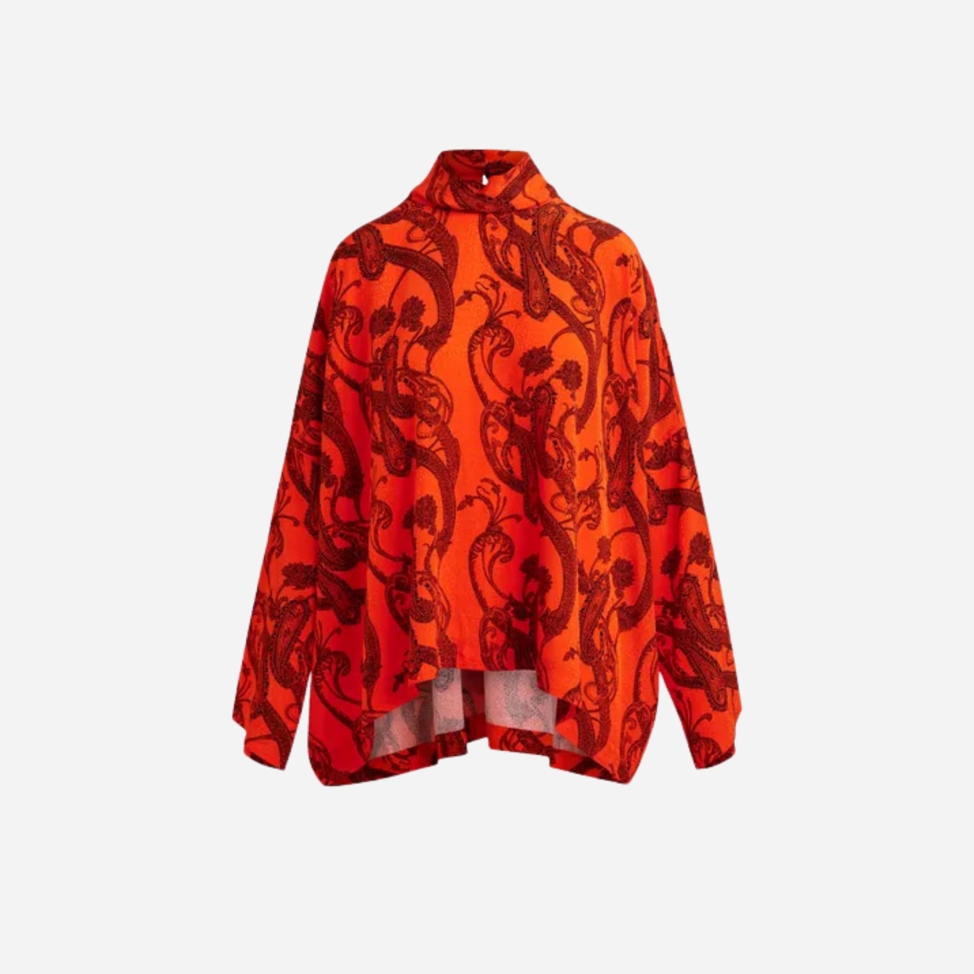 Oversized paisley top, crafted with a modern boxy silhouette and effortlessly relaxed drape. Designed with dropped shoulders and wide sleeves, it features a high neck collar and a discreet hidden zip fastening for a sleek finish. The wide hem adds balance to the voluminous shape, while the all-over paisley print brings a bold touch.