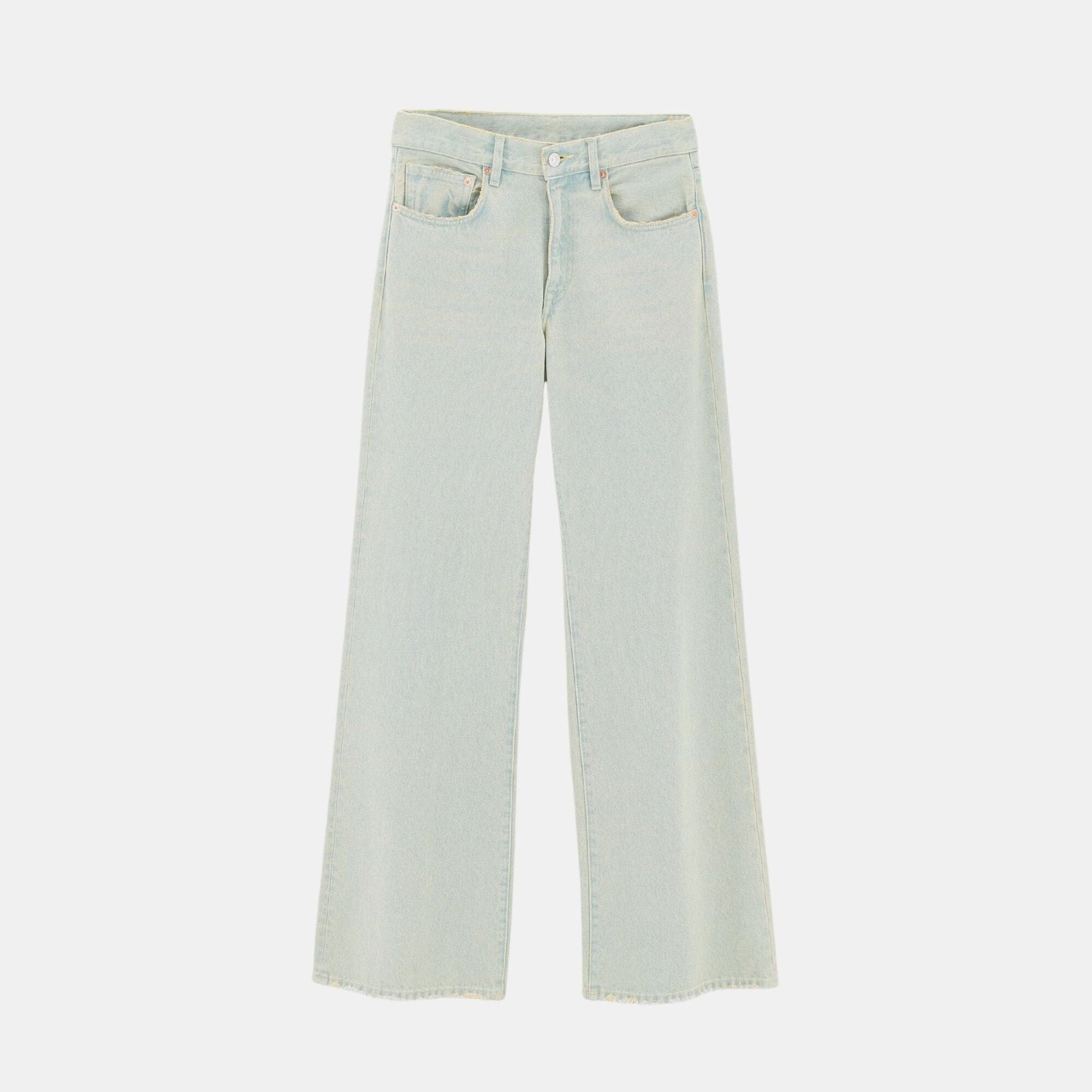 Relaxed, low-rise, baggy-style jeans with flared legs and light distress details on the pockets, made from dusty bleach denim.