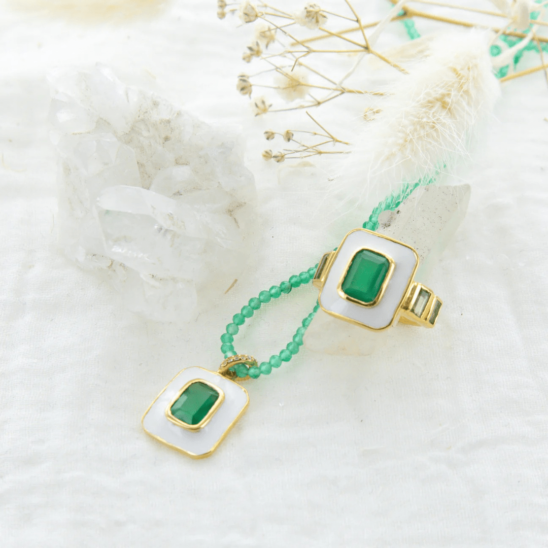 Laura necklace composed of an enameled pendant with a green Agat stone and green agats chain.