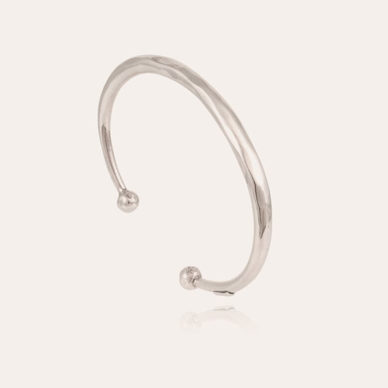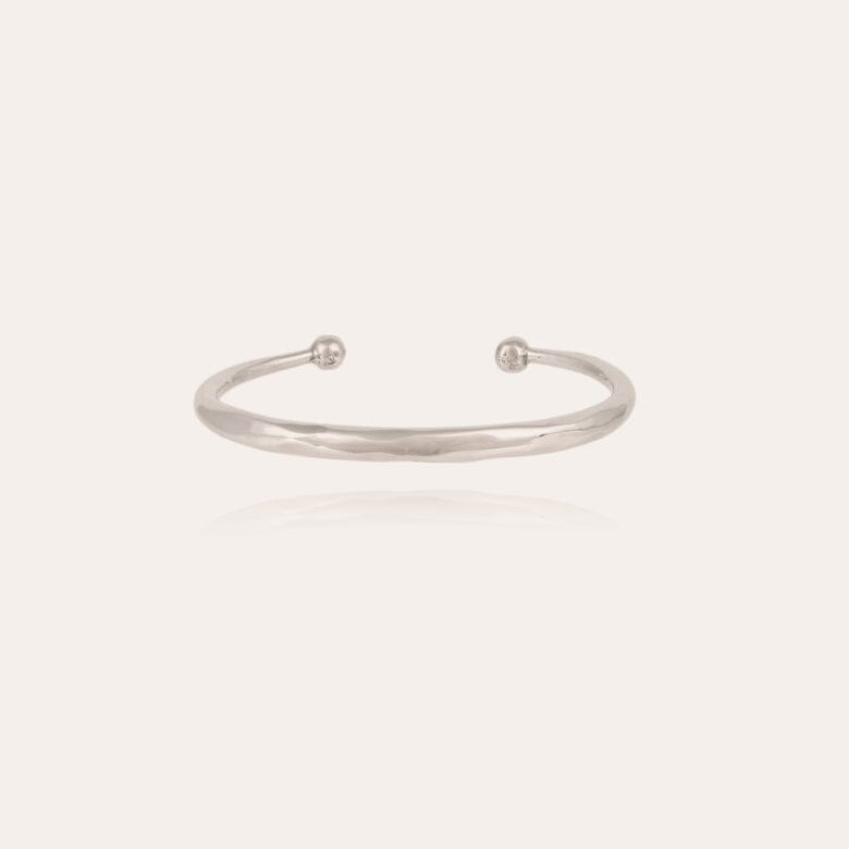 Silver plated cuff hand-hammered embellished with hand-hammered balls. Adjustable size.
