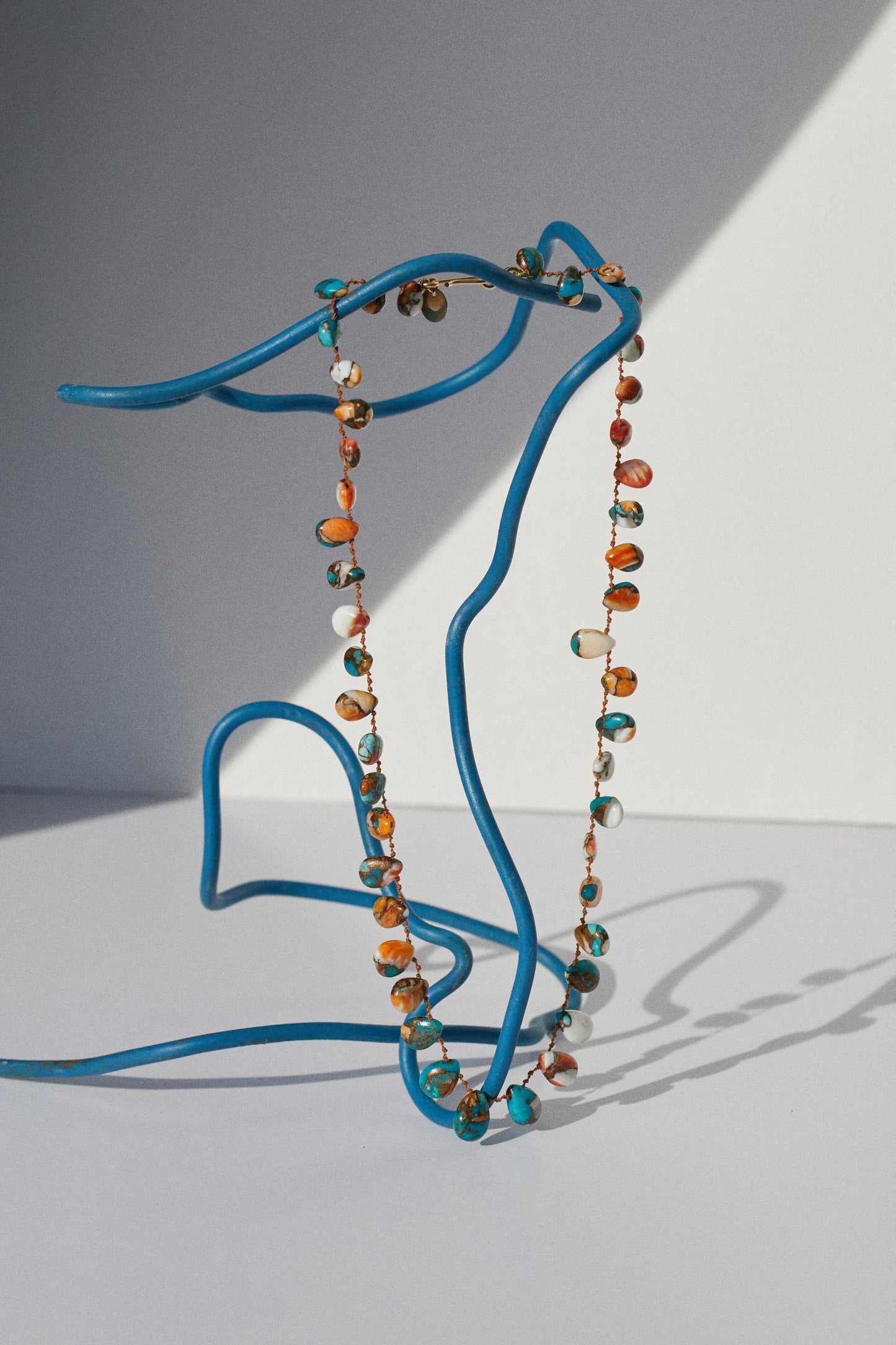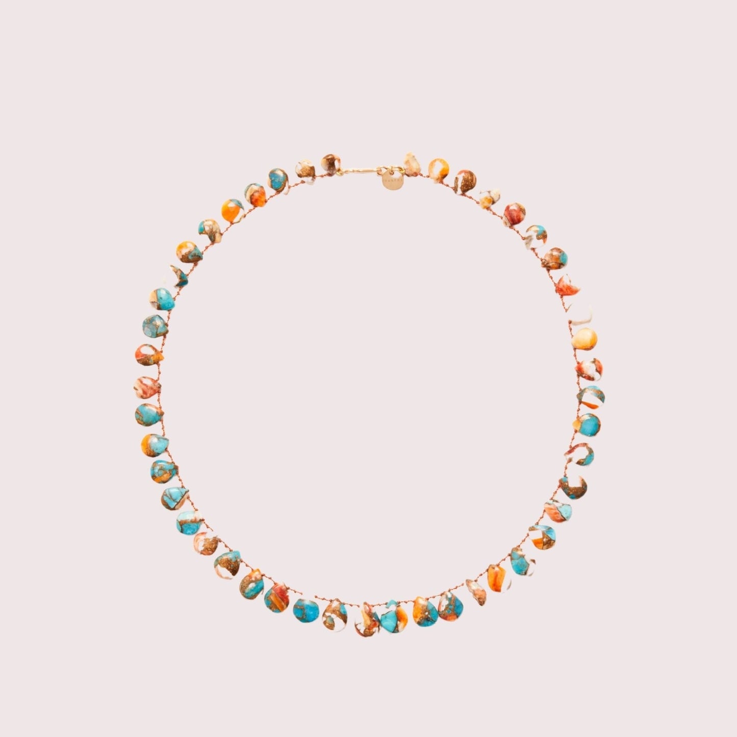 The Mojave necklace in turquoise stands out with the uniqueness of its stones, each hue capturing the essence of the vast deserts of the American Southwest. Its distinctive veins, ranging from blue to orange, evoke a vibrant land where light and color merge. This piece carries within it the strength and wisdom of ancient traditions, while offering a rare and authentic beauty. A natural radiance, both protective and soothing, is felt with every movement.