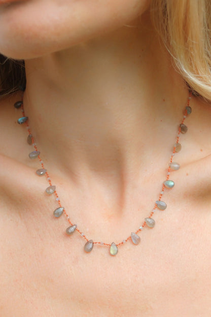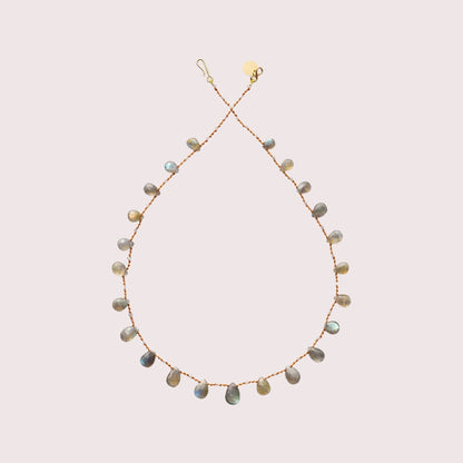 The 'Odin' labradorite necklace captures the magic of light with its iridescent reflections. Each carefully cut pearl reveals changing shades of blue, green and gray, like an aurora borealis frozen in stone. Labradorite, known for its protective and soothing properties, awakens creativity and strengthens intuition.