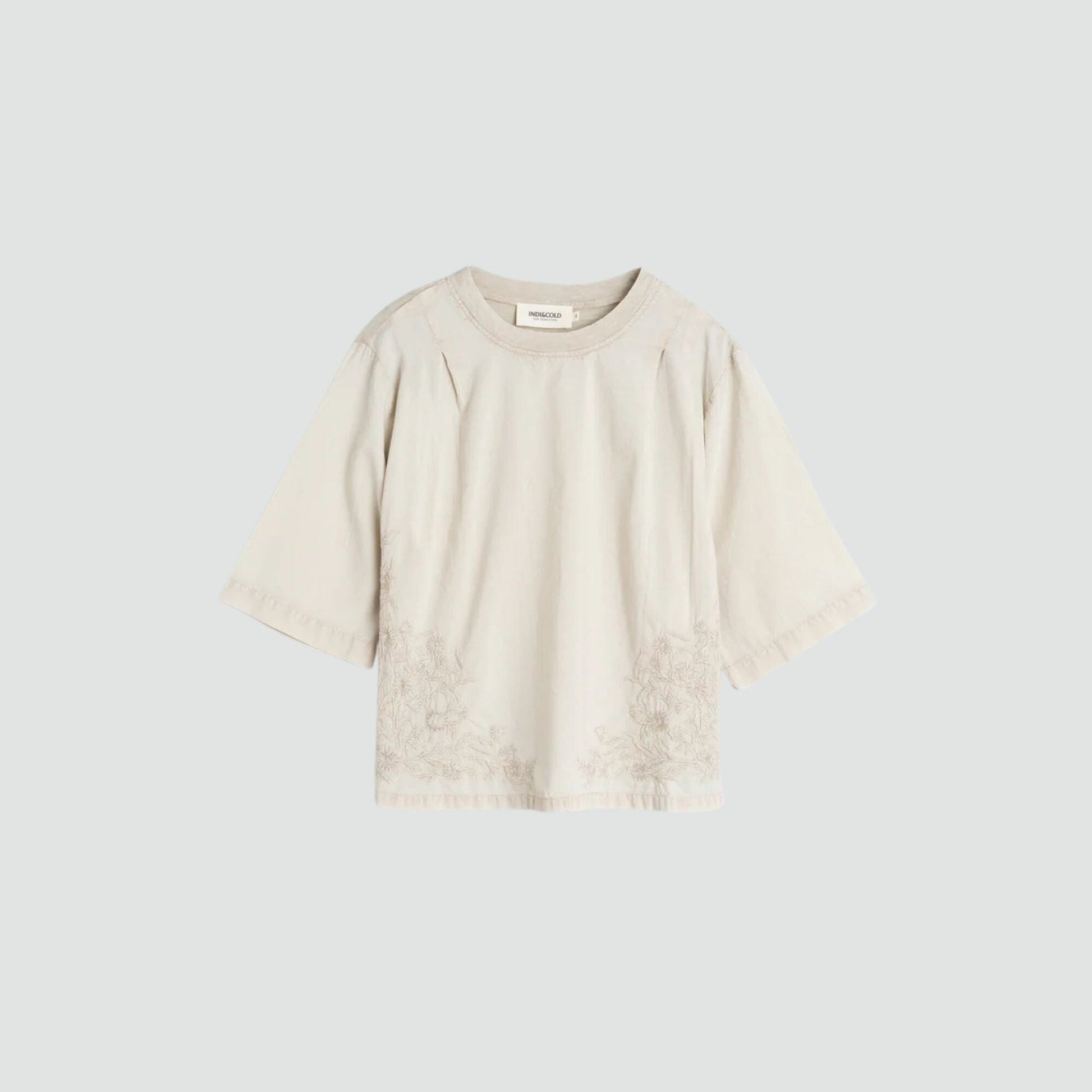 • Embroidery details with floral motif at the bottom sides and pleated shoulders • Combined slub jersey and embroidered voile fabric • Boxy fit: Designed with a square, wide and short cut