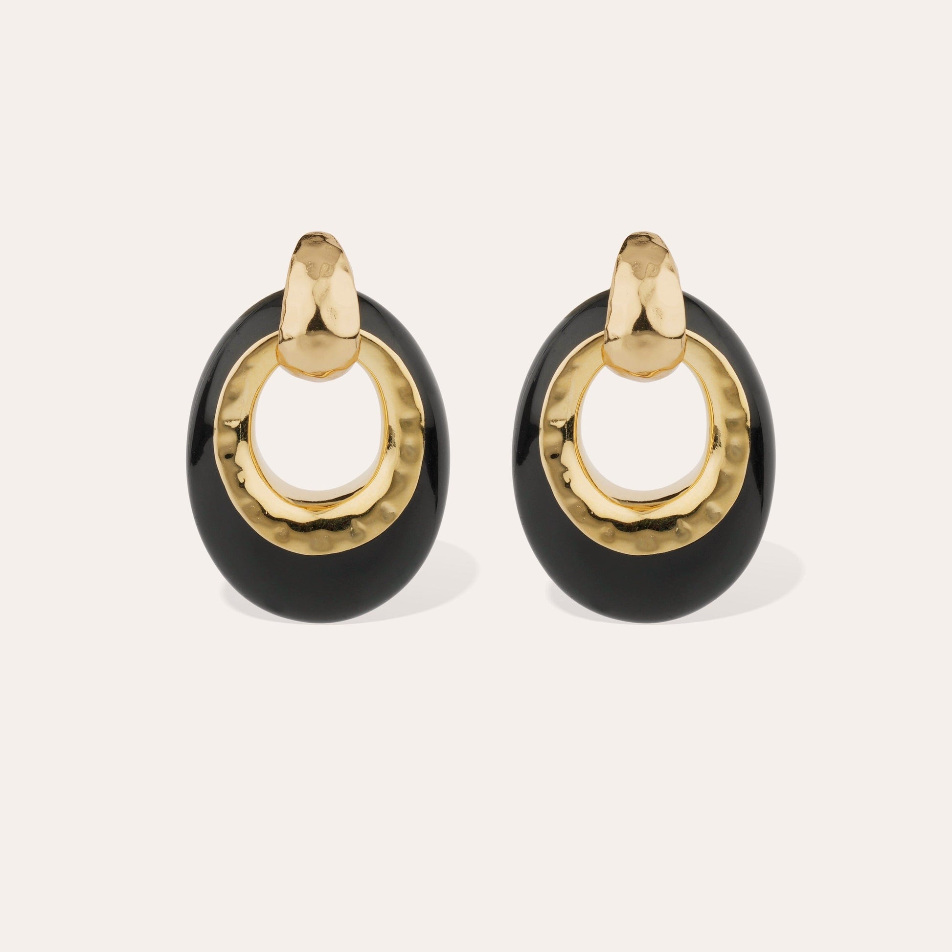 These gold-plated earrings combine an oval acetate ring derived from cotton or wood pulp with a radiant hammered element. The acetate reveals a warm, unique hue, enhanced by a hammered stud. A refined creation, blending elegance and craftsmanship.