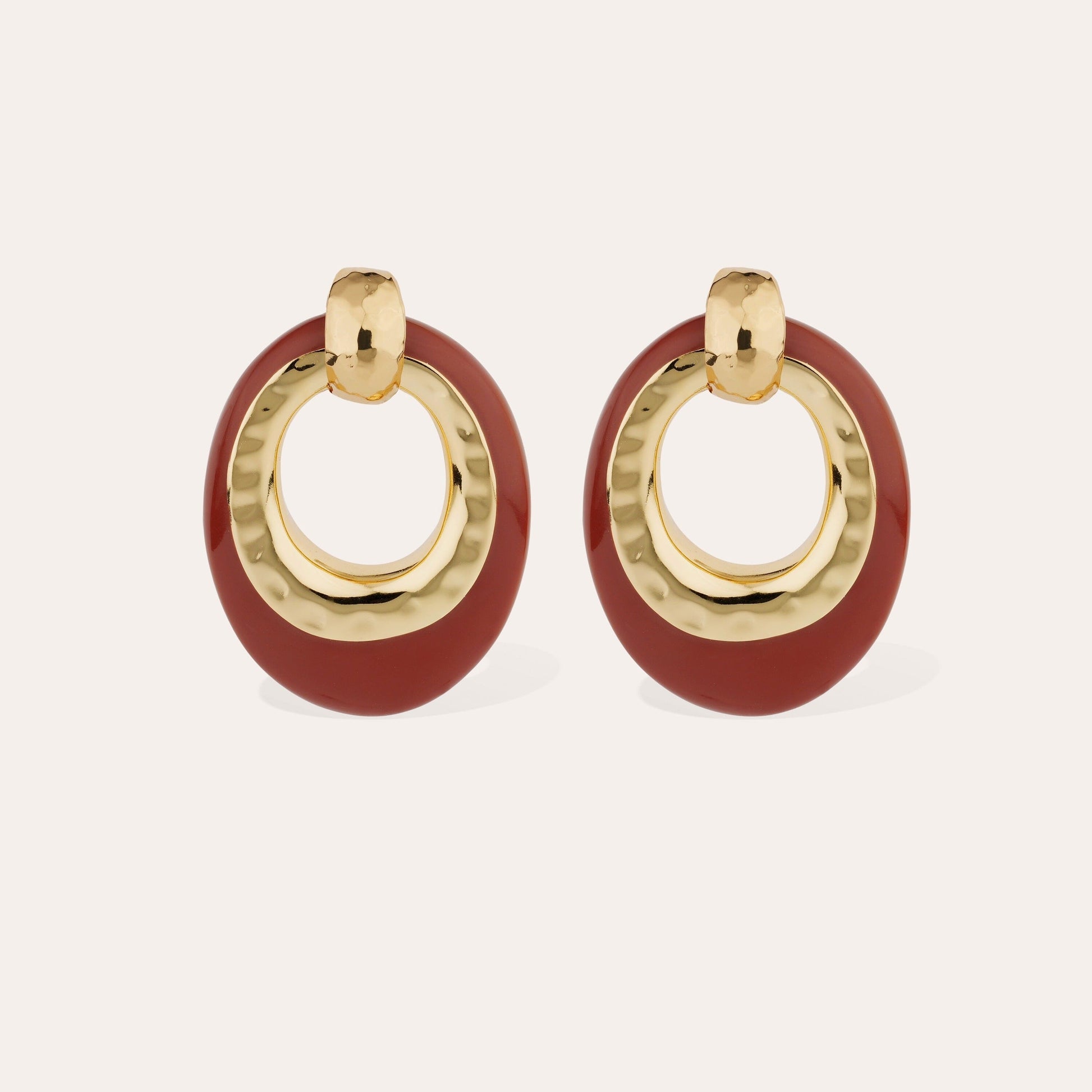 These gold-plated earrings combine an oval acetate ring derived from cotton or wood pulp'?with a radiant hammered element. The acetate reveals a warm, unique hue, enhanced by a hammered stud. A refined creation, blending elegance and craftsmanship.