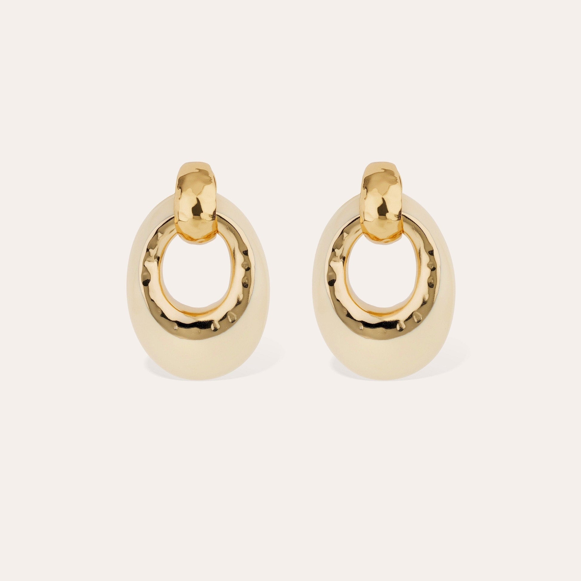 These gold-plated earrings combine an oval acetate ring derived from cotton or wood pulp with a radiant hammered element. The acetate reveals a warm, unique hue, enhanced by a hammered stud. A refined creation, blending elegance and craftsmanship.