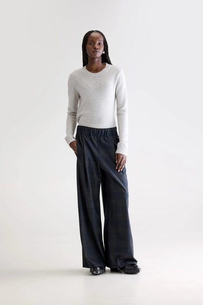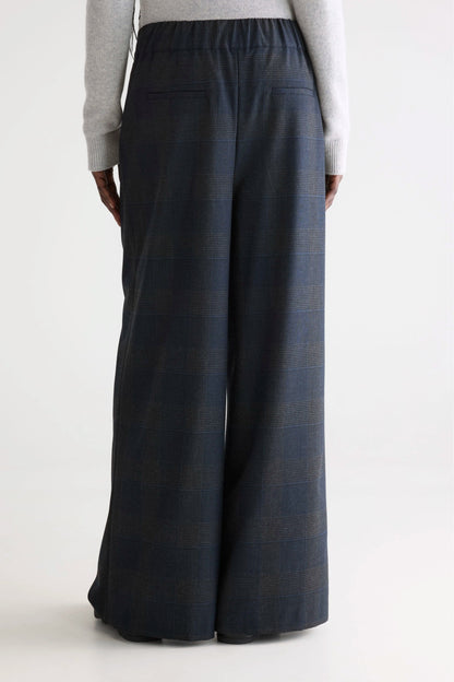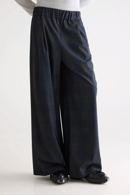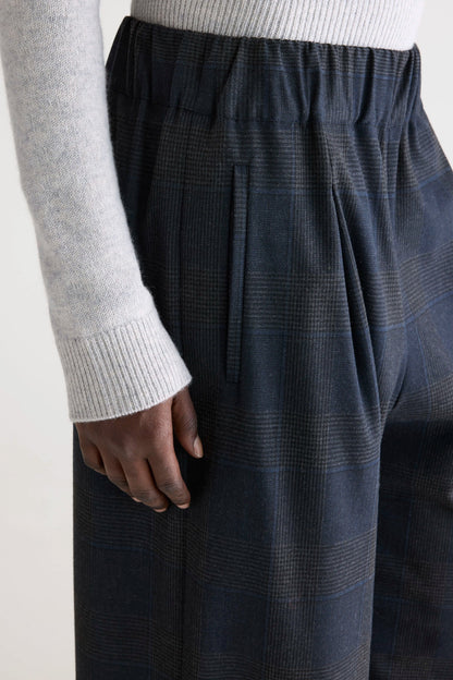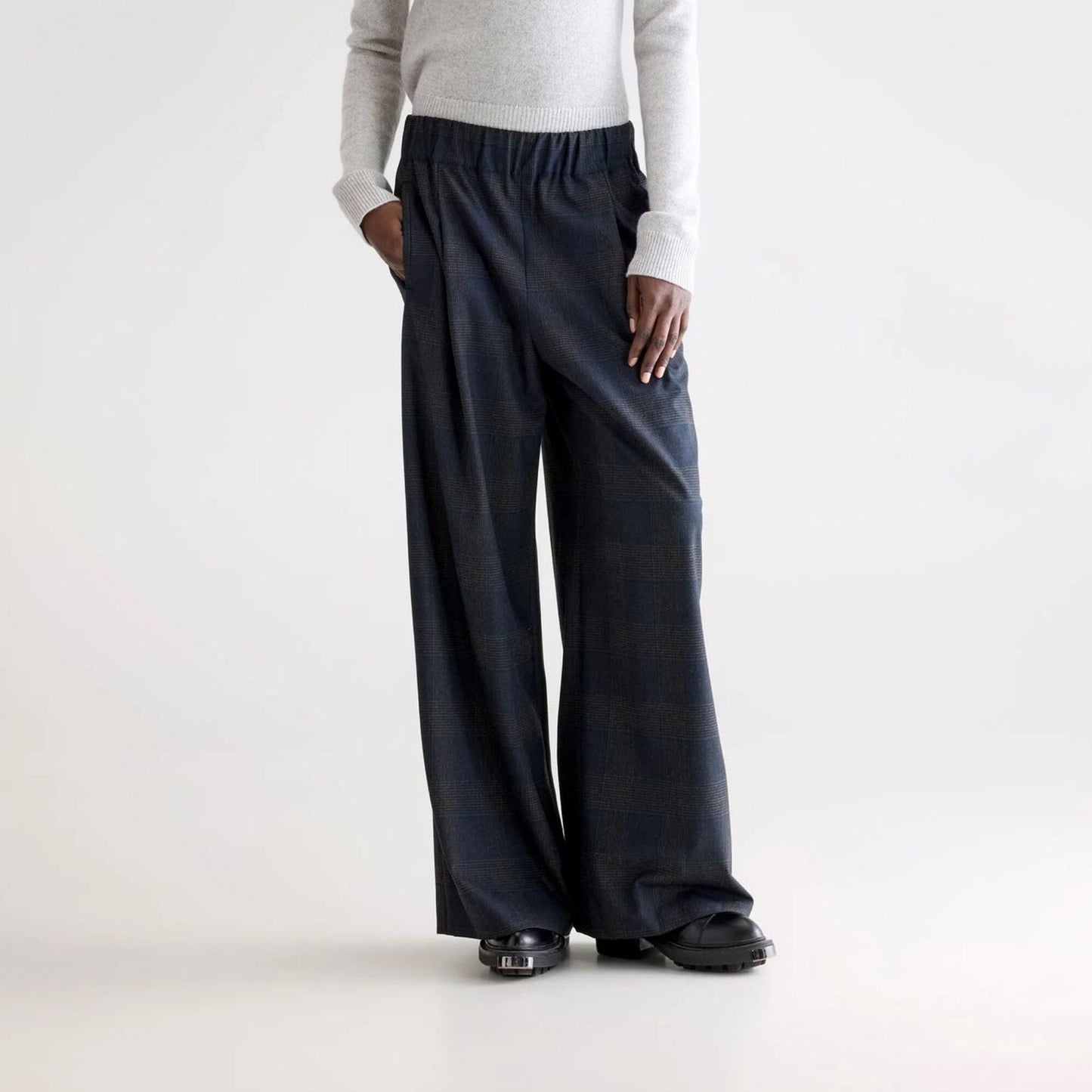 Wide-leg trousers with an elastic waist and welted pockets, in black watch checkered fabric.