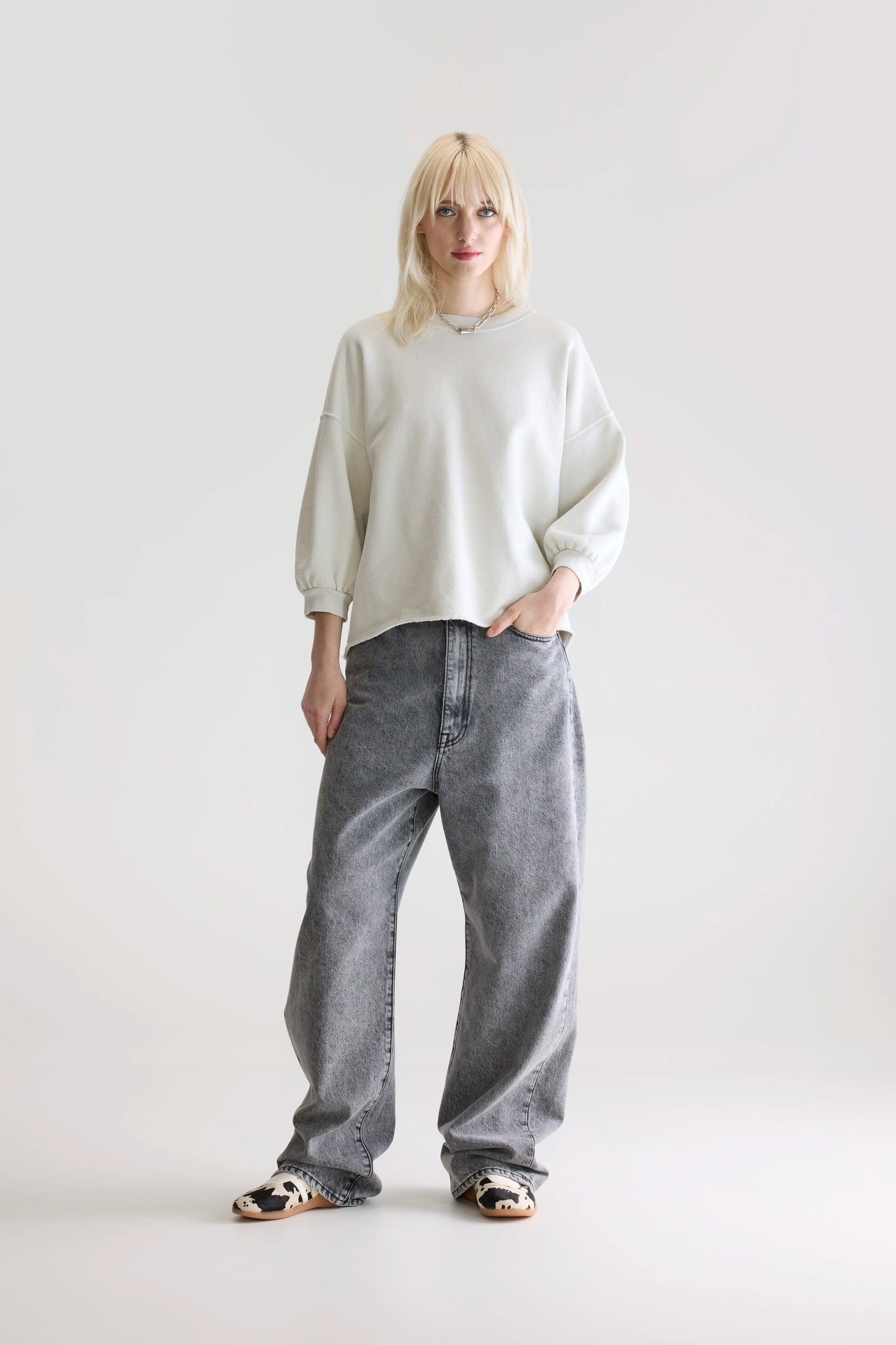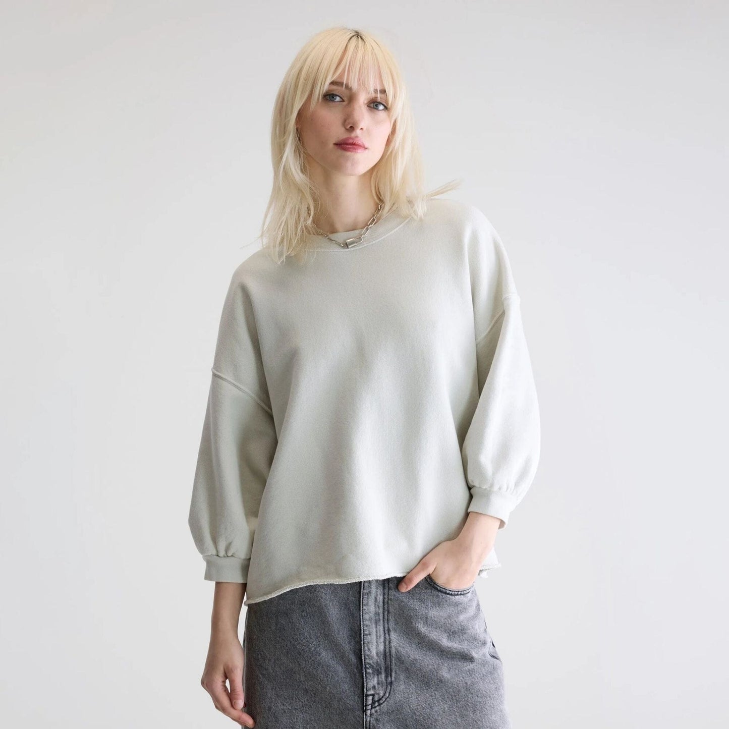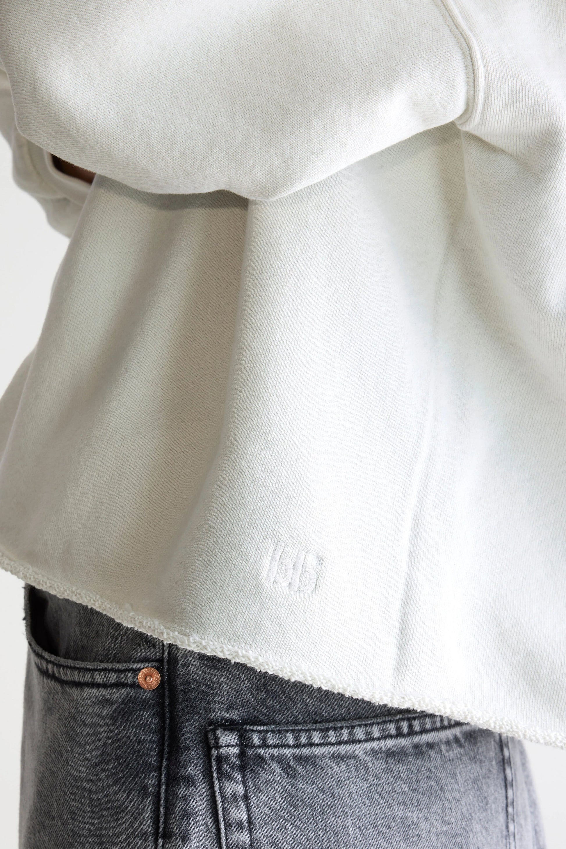 Relaxed crewneck sweatshirt in off white with raw-edge hem and 3/4 sleeves.