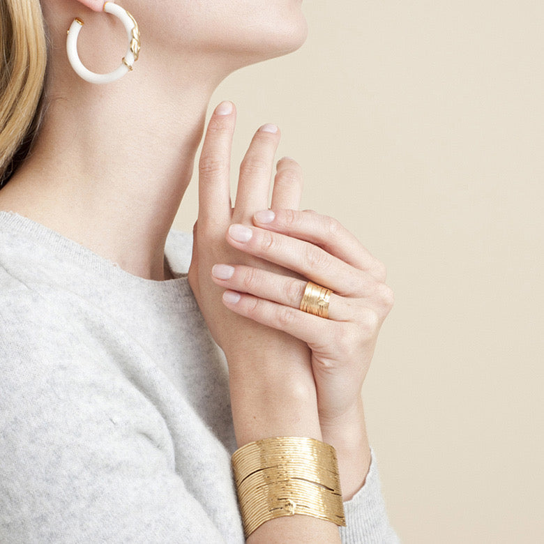 Inspired by a trip to Africa, this 24k gold plated ring is composed of finely worked stacked metallic threads. Adjustable size.